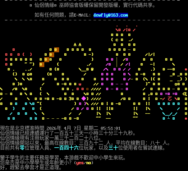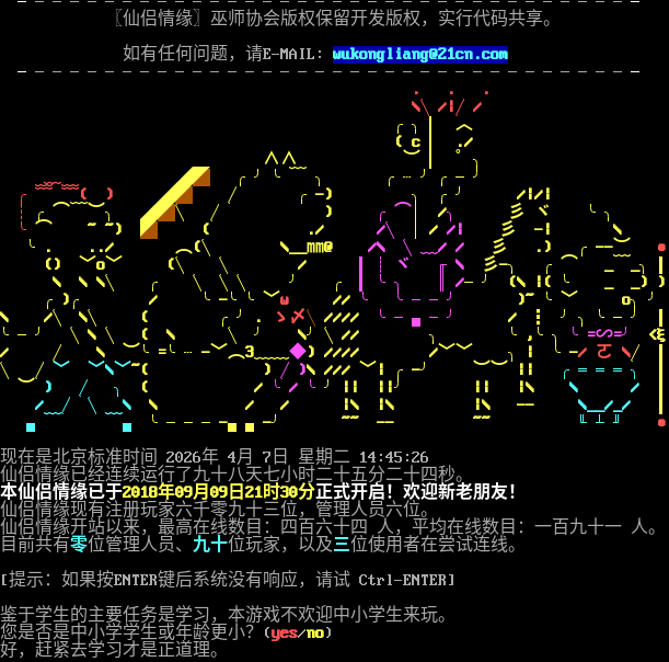 ──────────────────────────────────── 〖仙侣情缘〗巫师协会版权保留开发版权,实行代码共享。 如有任何问题,请E-MAIL: wukongliang@21cn.com ──────────────────────────────────── . . . \\╲/\|╱/ ╭╮▎ ︿ ( c ▎ ./ ∧∧ ︶ ▎ ゜╮ ﹏ ◢◤ ╭╯╰﹋ ╮ ╭┄╯╭─╯ ╭﹌ ﹌( ) ◢◤ ╱ ╭-) ╮ ╭╯ /\|/\| ┆╭⌒﹋︶╮ ◢◤╲ ╱ ) ╭⌒│ /╮ 彡 ヾ ╰╮ ╰⌒ ~ ~) ◤ ( ./ /╲ │/ /\| 彡 -\| \\ ╰. ../ ︵(╲ \\__㎜@ /\\ ╲﹏/ / 彡 .) ╭--︶ ● () ﹀o﹀ (╲ ╲ / ▍┊ヾ ╓\\ 彡-╮ ╭⌒ _﹋_╮┃ \\ \\ \\╲ ╭ ╲ ╲╲ ╯ ╭ ▍╰╮ ║/─╯ (\\ \|( ╰ _ _) ) ╭)╭ / ╰-╰╰﹀ω // ╰ ╰──╯ )~ ╰﹀ o╮╯ \\ /╲ \\╲ ( ╭╯. ゝ〆╲//// ╰─▄─╯ / ┇ ╯╮╰─╯ ┃ ╰─╯ ╲\\ ╲ ( \\ ╲ ╯ \\╯╲// ╮ ╰,╰╮╰=∽=╯ <ξ / ╱ \\ ︶╰=╰┄-﹀︵3﹏﹏◆) //// /﹀﹀ ╮\| ╰-/ ㄛ \\╱ ┃ ╲ ╱﹀ ﹀\\﹀~( ) ╱)\\ /// ﹀\| ╭-╯ ︶︶ \|\| ╭═══╮ ┃ ︶ ) ╱ ╮ ( / ╰/ ╰╯\|\| \|\|╯ \|\| \|\\ \\ / ┃ / ╱ ╲ \\ \\ / / \|\\ \|\\ \|\\ -- \\__/_/ ┃ ▄﹋ ﹋▄ ╰───-▄▄-╯ ~~ -- ~~ ╙┴╜ ● 现在是北京标准时间 2026年 4月 7日 星期二 14:45:26 仙侣情缘已经连续运行了九十八天七小时二十五分二十四秒。 本仙侣情缘已于2018年09月09日21时30分正式开启!欢迎新老朋友! 仙侣情缘现有注册玩家六千零九十三位,管理人员六位。 仙侣情缘开站以来,最高在线数目:四百六十四 人,平均在线数目:一百九十一 人。 目前共有零位管理人员、九十位玩家,以及三位使用者在尝试连线。 [提示:如果按ENTER键后系统没有响应,请试 Ctrl-ENTER] 鉴于学生的主要任务是学习,本游戏不欢迎中小学生来玩。 您是否是中小学学生或年龄更小?(yes/no) 好,赶紧去学习才是正道理。