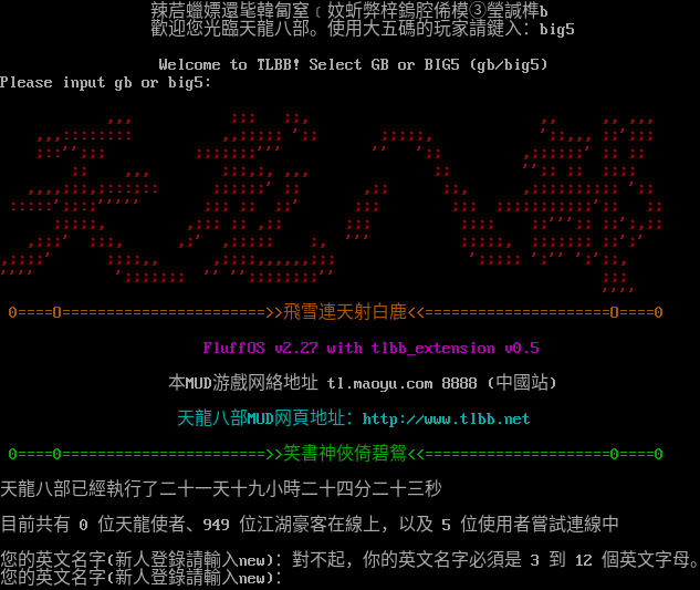 辣茩蠟嫖還毞韓匐窒﹝妏蚚弊梓鎢腔俙模③瑩諴榫b 歡迎您光臨天龍八部。使用大五碼的玩家請鍵入:big5 Welcome to TLBB! Select GB or BIG5 (gb/big5) Please input gb or big5: ,,, ;;; ;;, ,, ,, ,,, ,,,:::::::: ,,;;;;; ';; ;;;;;, ';;,,, ;;';;; ;::'';;; ;;;;;;;''' '' ';; ,;;;;;;' ;; ;; ;; ,,, ;;;,;, ,,, ;; '';; ;; ;;;; ,,,,;;;,;:::;:: ;;;;;;' ;; ,;; ;;, ,;;;;;;;;;; ';; :::::';;:;''''' ;;; ;; ;;' ;;; ;;; ;;;;;;;;;;;';; ;; ;;;;;, ,;;; ;; ,;; ;;; ;;;; ;;''';; ;;';,;; ,;;;' ;;;, ,;' ,;;;;; ;, ''' ;;;;;, ;;;;;;; ;;';' ,;;;;' ;;;;,, ,;;;;,,,,,,;;; ';;;;; ';'' ';';;, '''' ';;;;;;; '' '';;;;;;;;'' ;;; '''' 0=​===O=​======================>>飛雪連天射白鹿<<=​====================O=​===0 FluffOS v2.27 with tlbb_extension v0.5 本MUD游戲网絡地址 tl.maoyu.com 8888 (中國站) 天龍八部MUD网頁地址:http://www.tlbb.net 0=​===0=​======================>>笑書神俠倚碧鴛<<=​====================0=​===0 天龍八部已經執行了二十一天十九小時二十四分二十三秒 目前共有 0 位天龍使者、949 位江湖豪客在線上,以及 5 位使用者嘗試連線中 您的英文名字(新人登錄請輸入new):對不起,你的英文名字必須是 3 到 12 個英文字母。 您的英文名字(新人登錄請輸入new):