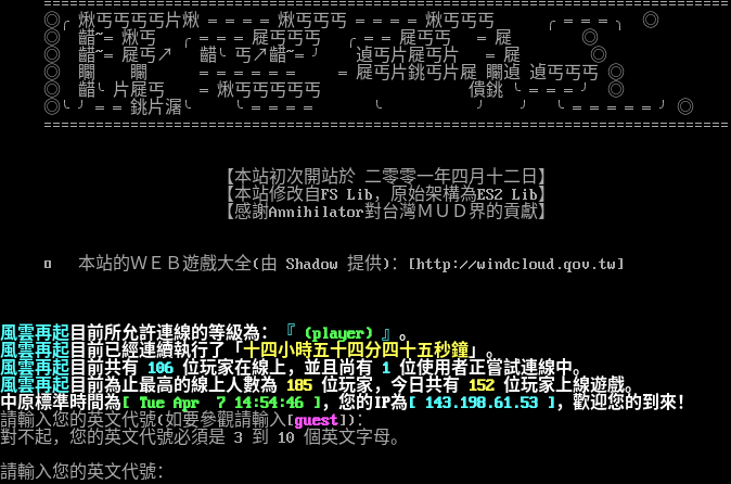 =​============================================================================== ◎╭煍丐丐丐丐片煍 ════煍丐丐丐 ════煍丐丐丐 ╭═══╮ ◎ ◎ 齰~═煍丐 ╭═══屣丐丐丐 ╭══屣丐丐 ═屣 ◎ ◎ 齰~═屣丐↗ 齰╰丐↗齰~═╯ 遉丐片屣丐片 ═屣 ◎ ◎ 矙 矙 ══════ ═屣丐片銚丐片屣 矙遉 遉丐丐丐 ◎ ◎ 齰╰片屣丐 ═煍丐丐丐丐丐 僓銚 ╰═══╯ ◎ ◎╰╯══銚片潳╰ ╰════ ╰ ╯ ╯ ╰═════╯◎ =​============================================================================== 【本站初次開站於 二零零一年四月十二日】 【本站修改自FS Lib,原始架構為ES2 Lib】 【感謝Annihilator對台灣MUD界的貢獻】 □ 本站的WEB遊戲大全(由 Shadow 提供):[http://windcloud.qov.tw] 風雲再起目前所允許連線的等級為:『 (player) 』。 風雲再起目前已經連續執行了「十四小時五十四分四十五秒鐘」。 風雲再起目前共有 106 位玩家在線上,並且尚有 1 位使用者正嘗試連線中。 風雲再起目前為止最高的線上人數為 185 位玩家,今日共有 152 位玩家上線遊戲。 中原標準時間為[ Tue Apr 7 14:54:46 ],您的IP為[ 143.198.61.53 ],歡迎您的到來! 請輸入您的英文代號(如要參觀請輸入[guest]): 對不起,您的英文代號必須是 3 到 10 個英文字母。 請輸入您的英文代號: