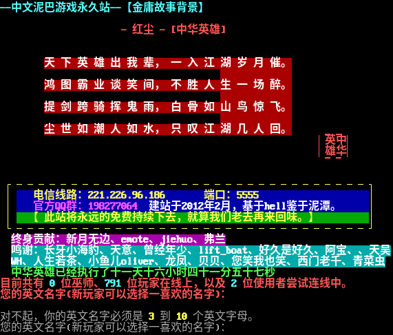 --中文泥巴游戏永久站--【金庸故事背景】 - 红尘 - [中华英雄] 天 下 英 雄 出 我 辈, 一 入 江 湖 岁 月 催。 鸿 图 霸 业 谈 笑 间, 不 胜 人 生 一 场 醉。 提 剑 跨 骑 挥 鬼 雨, 白 骨 如 山 鸟 惊 飞。 尘 世 如 潮 人 如 水, 只 叹 江 湖 几 人 回。 ▁▁ ▕英中▏ ▕雄华▏ ▔▔ ┌────────────────────────────────┐ │ 电信线路:221.226.96.186 端口:5555 │ │ 官方QQ群:198277064 建站于2012年2月,基于hell鉴于泥潭。 │ │ 【 此站将永远的免费持续下去,就算我们老去再来回味。】 │ └────────────────────────────────┘ 终身贡献:新月无边、emote、jiehuo、弗兰 鸣谢:长牙小海豹、天意、曾经年少、lift_boat、好久是好久、阿宝、、天吴 WH、人生若茶、小鱼儿oliver、龙凤、贝贝、您笑我也笑、西门老千、青菜虫 中华英雄已经执行了十一天十六小时四十一分五十七秒 目前共有 0 位巫师、791 位玩家在线上,以及 2 位使用者尝试连线中。 您的英文名字(新玩家可以选择一喜欢的名字): 对不起,你的英文名字必须是 3 到 10 个英文字母。 您的英文名字(新玩家可以选择一喜欢的名字):