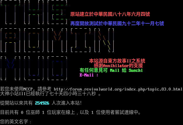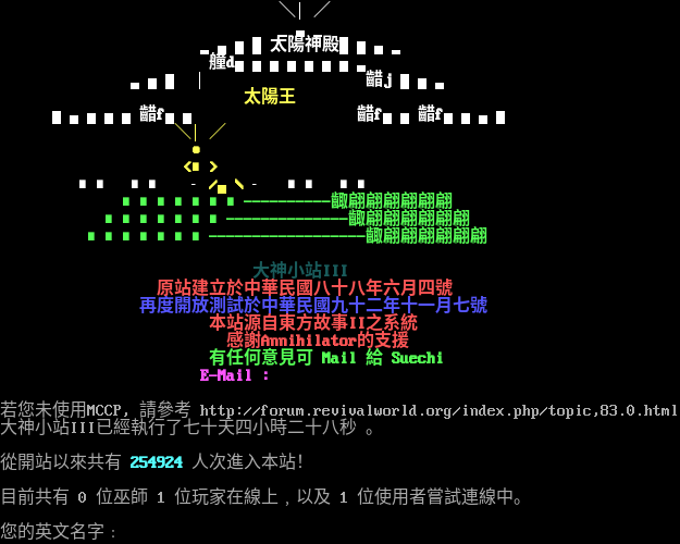 ◢███████████████◣ ◢◤ ◢█ 大神小站III ◢◤ ◢██ ◢◤ ◢███ 原站建立於中華民國八十八年六月四號 █ ̄ ̄ ̄ ̄ ̄ ̄ ̄ ̄ ̄ ̄ ̄ ̄ ̄ ̄ ̄████ █ ████ 再度開放測試於中華民國九十二年十一月七號 █ ████ █ ▃▃▃▃▃▃ ▃▃▃▃▃▃ ████ █ ██████ ██████ █ /\\ █ █ ██◤◥██ ██◤◥██ █∣∣█ █ ▅▅▅▅▅▅ ▅▅▅▅▅▅ █╰╯█ 這樣有Dune嗎? █ ████ █ ████ █ ██◤◤ 本站源自東方故事II之系統 █ ╯ █◤◤ 感謝Annihilator的支援 █ ◤◤ 有任何意見可 Mail 給 Suechi ◥███████████████◤ E-Mail : /█\ ▍ ▍ 若您未使用MCCP, 請參考 http://forum.revivalworld.org/index.php/topic,83.0.html 大神小站III已經執行了七十天四小時三十二秒 。 從開站以來共有 254925 人次進入本站! 目前共有 0 位巫師 1 位玩家在線上﹐以及 2 位使用者嘗試連線中。 您的英文名字﹕