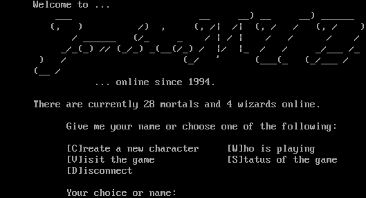 Welcome to ... ___ __ __) __ __) _​_____ (, ) /) , (, /\| /\| (, / / (, / ) / _​_____ (/_ _ / \| / \| / / / / _/_(_) // (_/_) _(__(/_) / \|/ \|_ / / _/___ /_ ) / (_/ ' (___(_ (_/___ / (__ / ... online since 1994. There are currently 28 mortals and 4 wizards online. Give me your name or choose one of the following: [C]reate a new character [W]ho is playing [V]isit the game [S]tatus of the game [D]isconnect Your choice or name: