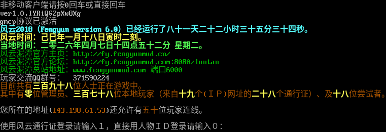 非移动客户端请按0回车或直接回车 ver1.0,IYRiQGZpXw8Xg gmcp协议已激活 风云2018(Fengyun version 6.0)已经运行了八十一天二十二小时三十五分三十四秒。 风云时间:己巳年一月十八日寅时二刻。 当地时间:二零二六年四月七日十四点五十二分 星期二。 风云泥潭官方主页:http://fy.fengyunmud.cn/ 风云泥潭官方论坛:http://fy.fengyunmud.com:8080/luntan 风云泥潭总站地址:www.fengyunmud.com 端口6000 玩家交流QQ群号: 371590224 目前共有三百九十八位人士正在游戏中。 其中有零位管理员、三百七十八位本地玩家(来自十九个(IP)网址的二十八个通行证)、及十八位尝试者。 您所在的地址(143.198.61.53)还允许有五十位玩家连线。 使用风云通行证登录请输入1,直接用人物ID登录请输入0: