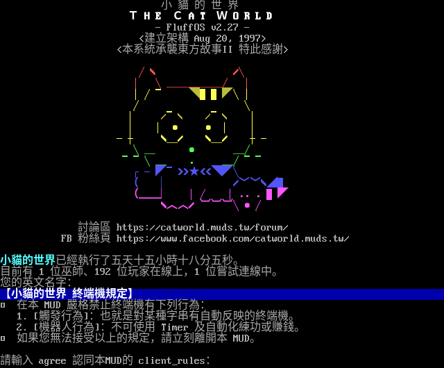 小 貓 的 世 界 T H E C A T W O R L D - FluffOS v2.27 - <建立架構 Aug 20, 1997> <本系統承襲東方故事II 特此感謝> ╱\\ /╲ │ ╲_____╱ │ │╱▔ ◥██◤╲│ ╱ ╲ │ /▔\\ /▔\\ │ │ │ ● ● │ │ ─┼ \\_/ \\_/ ┼─ ╲_ ● _╱ ▔▔╲_ . _╱▔▔ ┌─◤▔>>★<<◥◤╲ ( ︳ /﹀﹀\\◢█ (_​___︳ │╱ │... █◤ \\︿︿/ ︺︺︺╲●╱ 討論區 https://catworld.muds.tw/forum/ FB 粉絲頁 https://www.facebook.com/catworld.muds.tw/ 小貓的世界已經執行了五天十五小時十八分五秒。 目前有 1 位巫師、192 位玩家在線上,1 位嘗試連線中。 您的英文名字: 【小貓的世界 終端機規定】 □ 在本 MUD 嚴格禁止終端機有下列行為: 1. [觸發行為]:也就是對某種字串有自動反映的終端機。 2. [機器人行為]:不可使用 Timer 及自動化練功或賺錢。 □ 如果您無法接受以上的規定,請立刻離開本 MUD。 請輸入 agree 認同本MUD的 client_rules: