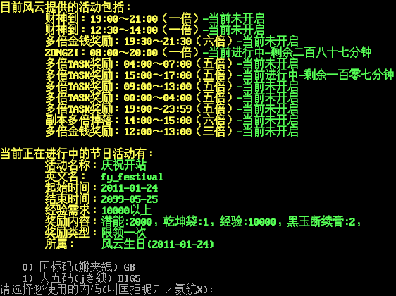 .; , ,,,.;.. ;; . ,,,.;.;..,,;;.; . ,..,,.; . , ;; ,;;.; , .;;.. ,;;;;;;;;;; , ..;; . .;; ,;; . ,,,, .;; . ;;.;,, , ..;;.; ,;;.​..... ,;;,,.;.;.. ,;; , , .;;;;;;;;;;; . ,;; .;;; . ,.; . ,...;.;;;;;.; ,.. ,,,;; .;.; ,,, ,,;;.. ,.; . ,..,,;;;;;;;;;;.;.;;;;; , ..;;;;;;; , ,.; ,;;;;.; , .. ,..;;;;.; ,.; . . ..;;.;.;.;.;;;;; . . .;,,;;.. ...;;;;;.;.;.;;;.; .;.;;;.. ,;;..;; .; . ;;;; . . , ;; . .; ,.; , . ..;; , . .; ,;; . .;.. ,,;;.. ,,,.;.​... ;; .. , .;; .;.; , ,;; , .;,, ,,.; ..;;;;;;;;;;;.. ,.; , .;;.;.; ,,.; .;;;;,, .. , .;,, ..;;; ,;;;;,,.. . . ,,;;.; .;.; ,,,.; ,;;.; ...;;;;; , , , . .​... ,,.. . . 狂 风 一 翻 滚 何 处 不 是 云 重点提示: 1. 降低读书和学习的难度,不再消耗精、神 2. 降低新手难度,huaman的送花任务可以到10w,并增加了奖励 3. 1w经验之后可以去tj n e ask jieri shizhe about reward领取开站奖励。 4. 请认真关注help whatsnew.txt 5. 开放QQ群:77309838 目前风云提供的活动包括: 财神到:19:00~21:00(一倍)-当前未开启 财神到:12:30~14:00(一倍)-当前未开启 多倍金钱奖励:19:30~21:30(六倍)-当前未开启 ZONGZI:08:00~20:00(一倍)-当前进行中-剩余二百八十七分钟 多倍TASK奖励:04:00~07:00(五倍)-当前未开启 多倍TASK奖励:15:00~17:00(五倍)-当前进行中-剩余一百零七分钟 多倍TASK奖励:09:00~13:00(五倍)-当前未开启 多倍TASK奖励:00:00~04:00(五倍)-当前未开启 多倍TASK奖励:19:00~23:59(五倍)-当前未开启 副本多倍掉落:14:00~15:00(六倍)-当前未开启 多倍金钱奖励:12:00~13:00(三倍)-当前未开启 当前正在进行中的节日活动有: 活动名称:庆祝开站 英文名: fy_festival 起始时间:2011-01-24 结束时间:2099-05-25 经验需求:10000以上 奖励内容:潜能:2000,乾坤袋:1,经验:10000,黑玉断续膏:2, 奖励类型:限领一次 所属: 风云生日(2011-01-24) 0) 国标码(瓣夹絏) GB 1) 大五码(jき絏) BIG5 请选择您使用的内码(叫匡拒眤ㄏノ氦航X):
