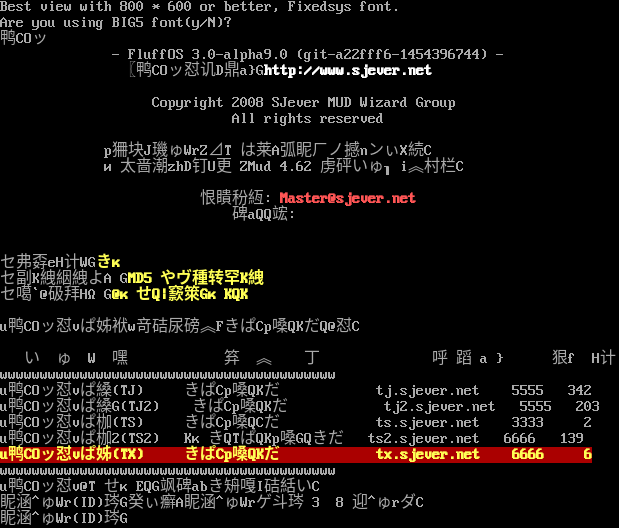Best view with 800 \* 600 or better, Fixedsys font. Are you using BIG5 font(y/N)? 鸭COッ - FluffOS 3.0-alpha9.0 (git-a22fff6-1454396744) - 〖鸭COッ怼讥D鼎a}Ghttp://www.sjever.net Copyright 2008 SJever MUD Wizard Group All rights reserved p狦块J璣ゅWrZ⊿Τは莱A弧眤ㄏノ撼nンぃX続C и太啬潮zhD钉U更 ZMud 4.62 虏砰いゅ┒i︽村栏C 恨瞶秎絚: Master@sjever.net 碑aQQ竤: 48833698  セ弗孬eH计WGきκ セ副K絏絪絏よΑGMD5 やヴ種转罕K絏 セ噶\`@砐拜HΩG@κせQ\|窾箂GκKQK u鸭COッ怼vぱ姊袱w竒硈尿磅︽FきぱCp嗓QKだQ@怼C い ゅ W 嘿 笲 ︽ 丁 呼 蹈 a } 狠f H计 wwwwwwwwwwwwwwwwwwwwwwwwwwwwwwwwwwwwwwwwww u鸭COッ怼vぱ縔(TJ) きぱCp嗓QKだ tj.sjever.net 5555 342 u鸭COッ怼vぱ縔G(TJ2) きぱCp嗓QKだ tj2.sjever.net 5555 203 u鸭COッ怼vぱ枷(TS) きぱCp嗓QCだ ts.sjever.net 3333 2 u鸭COッ怼vぱ枷2(TS2) KκきQTぱQKp嗓GQきだ ts2.sjever.net 6666 139 u鸭COッ怼vぱ姊(TX) きぱCp嗓QKだ tx.sjever.net 6666 6 wwwwwwwwwwwwwwwwwwwwwwwwwwwwwwwwwwwwwwwwww u鸭COッ怼v@ΤせκEQG飒碑abき矪嘎I硈絬いC 眤涵^ゅWr(ID)琌G癸ぃ癬A眤涵^ゅWrゲ斗琌 3 8 迎^ゅrダC 眤涵^ゅWr(ID)琌G