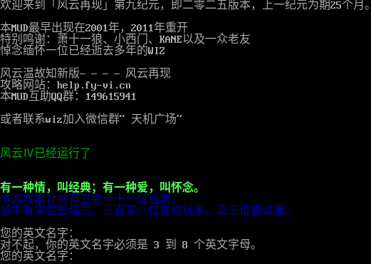 欢迎来到「风云再现」第九纪元,即二零二五版本,上一纪元为期25个月。 本MUD最早出现在2001年,2011年重开 特别鸣谢:萧十一狼、小西门、KANE以及一众老友 悼念缅怀一位已经逝去多年的WIZ 风云温故知新版————风云再现 攻略网站:help.fy-vi.cn 本MUD互助QQ群:149615941 或者联系wiz加入微信群“天机广场” 风云Ⅳ已经运行了五十一天五小时十六分十二秒。 有一种情,叫经典;有一种爱,叫怀念。 本游戏累计共有三百一十一位玩家。 其中有零位管理员、三百零八位在线玩家、及三位尝试者。 您的英文名字: 对不起,你的英文名字必须是 3 到 8 个英文字母。 您的英文名字: