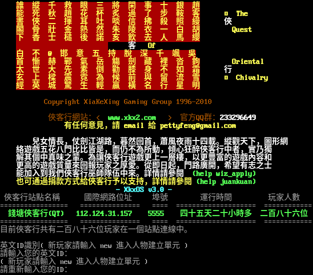 Welcome to chinese MUD XiaKeXing. Are you using BIG5 code?(Yes\|No) > Ok, use BIG5 code。 誰 縱 千 救 眼 三 將 閑 事 十 銀 趙 能 死 秋 趙 花 杯 炙 過 了 步 鞍 客 □ The 書 俠 二 揮 耳 吐 啖 信 拂 殺 照 縵 俠 閣 骨 壯 金 熱 然 朱 陵 衣 一 白 胡 Quest 下 香 士 槌 後 諾 亥 飲 去 人 馬 纓 客 Of 白 不 @ 邯 意 五 持 脫 深 千 颯 吳 首 慚 赫 鄲 氣 岳 觴 劍 藏 裡 沓 鉤 Oriental 太 世 大 先 素 倒 勸 膝 身 不 如 霜 行 玄 上 樑 震 霓 為 候 前 與 留 流 雪 □ Chivalry 經 英 城 驚 生 輕 贏 橫 名 行 星 明 Copyright XiaKeXing Gaming Group 1996-2010 俠客行網站:< www.xkx2.com > 官方QQ群:233296649 有任何意見,請 email 給 pettyfeng@gmail.com 兒女情長,仗劍江湖路,暮然回首,蕭風夜雨十四載。縱觀天下,圖形網 絡遊戲五花八門比比皆是,而仍不為所動,傾心狂醉俠客行中者,實乃獨 解其個中真味之輩。為讓俠客行遊戲更上一層樓,以更豐富的遊戲內容和 更高的遊戲質量來回報玩家之厚愛。從即日起,門路廣開,希望有志之士 能加入到我們俠客行巫師隊伍中來。詳情請參閱 (help wiz_apply) 也可通過捐款方式給俠客行予以支持,詳情請參閱 (help juankuan) - XkxOS v3.0 - 俠客行站點名稱 國際網路位址 埠號 運行時間 玩家人數 =​================ =​============== =​=== =​=================== =​=========== 錢塘俠客行(QT) 112.124.31.157 5555 四十五天二十小時多 二百八十六位 =​================ =​============== =​=== =​=================== =​=========== 目前俠客行共有二百八十六位玩家在一個站點連線中。 英文ID識別( 新玩家請輸入 new 進入人物建立單元 ) 請輸入您的英文ID: ( 新玩家請輸入 new 進入人物建立單元 ) 請重新輸入您的ID: