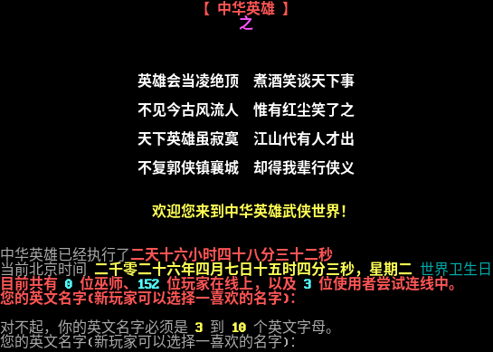 【 中华英雄 】 之 <<传奇延续>> 英雄会当凌绝顶 煮酒笑谈天下事 不见今古风流人 惟有红尘笑了之 天下英雄虽寂寞 江山代有人才出 不复郭侠镇襄城 却得我辈行侠义 欢迎您来到中华英雄武侠世界! 中华英雄已经执行了二天十六小时四十八分三十二秒 当前北京时间 二千零二十六年四月七日十五时四分三秒,星期二 世界卫生日 目前共有 0 位巫师、152 位玩家在线上,以及 3 位使用者尝试连线中。 您的英文名字(新玩家可以选择一喜欢的名字): 对不起,你的英文名字必须是 3 到 10 个英文字母。 您的英文名字(新玩家可以选择一喜欢的名字):