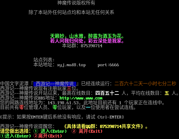 神魔传说版权所有 除了本站外任何站点均和本站无任何关系 天籁妙,山水雅,醉露为酒玉为花。 若人问我归何处,彩云深处是我家。 本站群:875390714 站点列表: 本站地址:xyj.mud8.top port:6666 中国文字泥潭『 西游记--神魔传说 』已经连续运行:二百六十二天一小时七分二秒 西游记--神魔传说现有注册玩家三位。 西游记--神魔传说开站以来,最高在线数目:四百五十二 人,平均在线数目:五 人。 西游记--神魔传说BBS地址:http://www.www.com 您的网路连线地址为:143.198.61.53,此地址目前还有 1 个玩家正在连线中。 目前共有零位管理人员、零位玩家,以及一位使用者在尝试连线。 [提示:如果按ENTER键后系统没有响应,请试 Ctrl-ENTER] 西游记--神魔传说提醒您: 《具体请看QQ群:875390714共享文件》。 请您做出选择:① 进入(Enter) ② 离开(Exit) ①进入(Enter) ②离开(Exit)