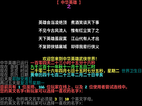 【 中华英雄 】 之 <<传奇延续>> 英雄会当凌绝顶 煮酒笑谈天下事 不见今古风流人 惟有红尘笑了之 天下英雄虽寂寞 江山代有人才出 不复郭侠镇襄城 却得我辈行侠义 欢迎您来到中华英雄武侠世界! 中华英雄已运行 一百零四天二十三小时十五分十六秒 现在 游戏 时间 九千三百十一年秋十一月十五日二时 现在 北京 时间 二千零二十六年四月七日十五时七分五秒,星期二 世界卫生日 现在 农历 日期 黄帝历四千七百二十三年二月二十日辛亥 后天是耶酥受难日 再过五天是复活节星期一 目前共有 1 位巫师、166 位玩家在线上,以及 2 位使用者尝试连线中。 您的英文名字(新玩家可以选择一喜欢的名字): 对不起,你的英文名字必须是 3 到 10 个英文字母。 您的英文名字(新玩家可以选择一喜欢的名字):