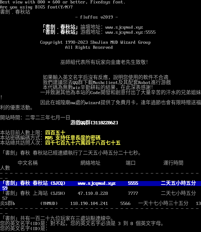 Best view with 800 \* 600 or better, Fixedsys font. Are you using BIG5 font(Y/N)? 書劍﹒春秋站 - fluffos v2019 - 「書劍﹒春秋站」論壇地址:www.sjcqmud.xyz 「書劍﹒春秋站」游戲地址:www.sjcqmud.xyz:5555 Copyright 1998-2023 ShuJian MUD Wizard Group All Rights Reserved 巫師組代表所有玩家向金庸老先生致敬! 如果輸入英文名字后沒有反應,說明您使用的軟件不合適 我們建議您去QQ群下載Mushclient及其配套Robot進行游戲 本代碼為無數wiz辛勤耕耘的結果,在此深表感謝! 一并致謝其他為本站的Code開發和創意付出了大量辛苦的汗水的兄弟姐妹! 因此在城隍廟nw處的wizard提供了免費月卡,逢年過節也會有限時贈送福利的優惠活動。 開站時間:二零二三年七月一日 游戲QQ群[311822862] 本站目前人數上限:四百五十 本站密碼編碼方式:MD5 支持任意長度的密碼 本站總共訪問人次:四千七百九十六萬四千八百七十五 「書劍」春秋 春秋站已經連續執行了二天五小時五分二十七秒。 中文名稱 網絡地址 端口 運行時間 人數 ────────────────────────────────────────── 「書劍」春秋 春秋站 (SJCQ) www.sjcqmud.xyz 5555 二天五小時五分 59 「書劍」春秋 上海站 (SJSH) 47.110.8.228 7777 二天七小時五分 57 炎S群b (YHMUD) 118.190.104.241 5566 一天十七小時三十五分 13 ────────────────────────────────────────── 「書劍」共有一百二十九位玩家在三處站點連線中。 您的英文名字(ID)是:對不起,您的英文名字必須是 3 到 8 個英文字母。 您的英文名字(ID)是: