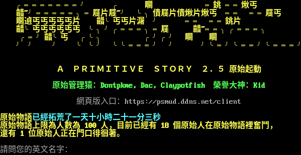 ╭═══════╯ ╭ 矙 ═銚 ══煍丐 齰~╯═════╮═屣片屣~╯ ╰╮僓屣片僓煍片煍丐 ══ ══屣丐 矙遉丐丐丐丐丐片 齰╰丐丐片潳 ╯ ══ ══銚片 齰╰丐丐丐丐丐丐 ╰╮╯╭═══╮═屣 齰~══╮╭═══╮ ╭═╯齰╰丐 ╭╰╮ ╭╯╭╯ 矙 矙 ╯ ╯ ╯ ╰ ╰╯ ╰╰═══╯ ╯ ╯╰═╯╰══╯╰═══╯ A PRIMITIVE STORY 2.5 原始起動 原始管理猿:Dontpkme, Dac, Claypotfish 榮譽大神:Kid 網頁版入口:https://psmud.ddns.net/client 原始物語已經拓荒了一天十小時二十一分三秒 原始物語上限為人數為 100 人,目前已經有 18 個原始人在原始物語裡奮鬥, 還有 1 位原始人正在門口徘徊著。 請問您的英文名字: