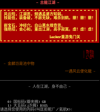 - 古龍江湖 - ┏━━━━━━━━━━━━━━━━━━━━━━━━┓ ┃风云险,江湖恶,频遇孟婆方知弱。 ┃ ┃技能低,装备破,不敌无缺,难杀别鹤。撤!撤!撤!┃ ┃ ┃ ┃嵌宝石,冲经穴。白山黑水搜奇货。 ┃ ┃强绝招,会心和。重出江湖,高手寂寞。虐!虐!虐!┃ ┃ ┃ ┃ Lucker重游鬼门关 ┃ ┗━━━━━━━━━━━━━━━━━━━━━━━━┛ ▁▁ ▕奇经▏ ▕八脉▏ ▔▔ - 金麟岂是池中物 一遇风云便化龍 - _​___________________________________________________ - 人在江湖,身不由己 - 0) 国标码(瓣夹絏) GB 1) 大五码(jき絏) BIG5 请选择您使用的内码(叫匡拒眤ㄏノ氦航X):