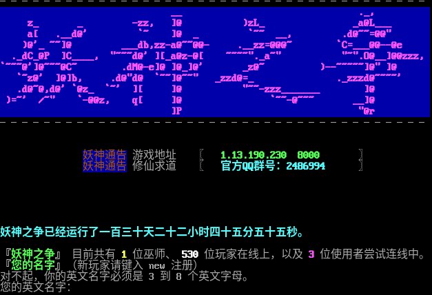 ─────────────────────────────────────── __ ._, z_ _ -zz, ]@ )zL_ _a@L___ a[ .__d@' \`~ ]@ _ \`~~ __, .d@~~=@@" )@'_ ~~]@ ___db,zz-a@~~@@- .__zz=@@@~ \`C=​___@@--@e ._dC_@P ]C_​___, "​~~~d@' ][_a@z-@[ ~​~~~"._a~" "​~".O@__]@@zzz, \`~~~@']@~~~@C~ .dM@-e]@ ]@_]@' _z@~ )-​-~~~~~]@" ]@ \`~z@' ]@]b, .d@"d@ \`~~]@~~" _zzd@=_ ._zzzd@~​~~~' .d@~@,d@' \`@z_ \`~' ][ ]@ "​~~-zzz_​______ ]@ )=~' /~" \`-@@z, q[ ]@ \`~~-@~~~ __]@ ]P "@r ─────────────────────────────────────── 妖神通告 游戏地址 〖 1.13.190.230 8000 〗 妖神通告 修仙求道 〖 官方QQ群号:2486994 〗 妖神之争已经运行了一百三十天二十二小时四十五分五十五秒。 『妖神之争』 目前共有 1 位巫师、 530 位玩家在线上,以及 3 位使用者尝试连线中。 『您的名字』(新玩家请键入 new 注册) 对不起,你的英文名字必须是 3 到 8 个英文字母。 您的英文名字: