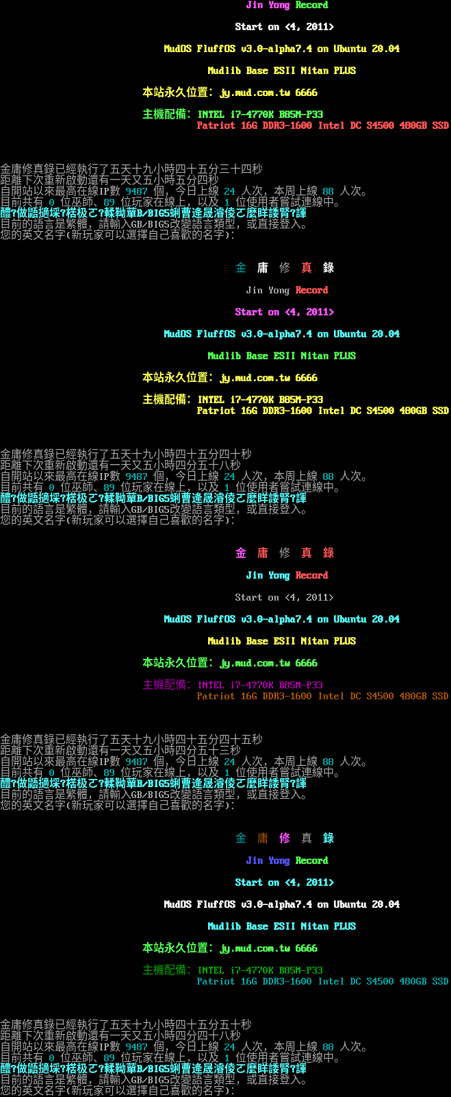 金 庸 修 真 錄 Jin Yong Record Start on <4, 2011> MudOS FluffOS v3.0-alpha7.4 on Ubuntu 20.04 Mudlib Base ESII Nitan PLUS 本站永久位置:jy.mud.com.tw 6666 主機配備:INTEL i7-4770K B85M-P33 Patriot 16G DDR3-1600 Intel DC S4500 480GB SSD 金庸修真錄已經執行了五天十九小時四十五分二十三秒 距離下次重新啟動還有一天又五小時五分十五秒 自開站以來最高在線IP數 9487 個,今日上線 24 人次,本周上線 88 人次。 目前共有 0 位巫師、89 位玩家在線上,以及 1 位使用者嘗試連線中。 醴?做鼯擿埰?楛极ㄛ?輮靿蕇B/BIG5蜊曹逄晟濬倰ㄛ麼眻諉腎?諢 目前的語言是繁體,請輸入GB/BIG5改變語言類型,或直接登入。 您的英文名字(新玩家可以選擇自己喜歡的名字): 金 庸 修 真 錄 Jin Yong Record Start on <4, 2011> MudOS FluffOS v3.0-alpha7.4 on Ubuntu 20.04 Mudlib Base ESII Nitan PLUS 本站永久位置:jy.mud.com.tw 6666 主機配備:INTEL i7-4770K B85M-P33 Patriot 16G DDR3-1600 Intel DC S4500 480GB SSD 金庸修真錄已經執行了五天十九小時四十五分二十九秒 距離下次重新啟動還有一天又五小時五分九秒 自開站以來最高在線IP數 9487 個,今日上線 24 人次,本周上線 88 人次。 目前共有 0 位巫師、89 位玩家在線上,以及 1 位使用者嘗試連線中。 醴?做鼯擿埰?楛极ㄛ?輮靿蕇B/BIG5蜊曹逄晟濬倰ㄛ麼眻諉腎?諢 目前的語言是繁體,請輸入GB/BIG5改變語言類型,或直接登入。 您的英文名字(新玩家可以選擇自己喜歡的名字): 金 庸 修 真 錄 Jin Yong Record Start on <4, 2011> MudOS FluffOS v3.0-alpha7.4 on Ubuntu 20.04 Mudlib Base ESII Nitan PLUS 本站永久位置:jy.mud.com.tw 6666 主機配備:INTEL i7-4770K B85M-P33 Patriot 16G DDR3-1600 Intel DC S4500 480GB SSD 金庸修真錄已經執行了五天十九小時四十五分三十四秒 距離下次重新啟動還有一天又五小時五分四秒 自開站以來最高在線IP數 9487 個,今日上線 24 人次,本周上線 88 人次。 目前共有 0 位巫師、89 位玩家在線上,以及 1 位使用者嘗試連線中。 醴?做鼯擿埰?楛极ㄛ?輮靿蕇B/BIG5蜊曹逄晟濬倰ㄛ麼眻諉腎?諢 目前的語言是繁體,請輸入GB/BIG5改變語言類型,或直接登入。 您的英文名字(新玩家可以選擇自己喜歡的名字): 金 庸 修 真 錄 Jin Yong Record Start on <4, 2011> MudOS FluffOS v3.0-alpha7.4 on Ubuntu 20.04 Mudlib Base ESII Nitan PLUS 本站永久位置:jy.mud.com.tw 6666 主機配備:INTEL i7-4770K B85M-P33 Patriot 16G DDR3-1600 Intel DC S4500 480GB SSD 金庸修真錄已經執行了五天十九小時四十五分四十秒 距離下次重新啟動還有一天又五小時四分五十八秒 自開站以來最高在線IP數 9487 個,今日上線 24 人次,本周上線 88 人次。 目前共有 0 位巫師、89 位玩家在線上,以及 1 位使用者嘗試連線中。 醴?做鼯擿埰?楛极ㄛ?輮靿蕇B/BIG5蜊曹逄晟濬倰ㄛ麼眻諉腎?諢 目前的語言是繁體,請輸入GB/BIG5改變語言類型,或直接登入。 您的英文名字(新玩家可以選擇自己喜歡的名字): 金 庸 修 真 錄 Jin Yong Record Start on <4, 2011> MudOS FluffOS v3.0-alpha7.4 on Ubuntu 20.04 Mudlib Base ESII Nitan PLUS 本站永久位置:jy.mud.com.tw 6666 主機配備:INTEL i7-4770K B85M-P33 Patriot 16G DDR3-1600 Intel DC S4500 480GB SSD 金庸修真錄已經執行了五天十九小時四十五分四十五秒 距離下次重新啟動還有一天又五小時四分五十三秒 自開站以來最高在線IP數 9487 個,今日上線 24 人次,本周上線 88 人次。 目前共有 0 位巫師、89 位玩家在線上,以及 1 位使用者嘗試連線中。 醴?做鼯擿埰?楛极ㄛ?輮靿蕇B/BIG5蜊曹逄晟濬倰ㄛ麼眻諉腎?諢 目前的語言是繁體,請輸入GB/BIG5改變語言類型,或直接登入。 您的英文名字(新玩家可以選擇自己喜歡的名字): 金 庸 修 真 錄 Jin Yong Record Start on <4, 2011> MudOS FluffOS v3.0-alpha7.4 on Ubuntu 20.04 Mudlib Base ESII Nitan PLUS 本站永久位置:jy.mud.com.tw 6666 主機配備:INTEL i7-4770K B85M-P33 Patriot 16G DDR3-1600 Intel DC S4500 480GB SSD 金庸修真錄已經執行了五天十九小時四十五分五十秒 距離下次重新啟動還有一天又五小時四分四十八秒 自開站以來最高在線IP數 9487 個,今日上線 24 人次,本周上線 88 人次。 目前共有 0 位巫師、89 位玩家在線上,以及 1 位使用者嘗試連線中。 醴?做鼯擿埰?楛极ㄛ?輮靿蕇B/BIG5蜊曹逄晟濬倰ㄛ麼眻諉腎?諢 目前的語言是繁體,請輸入GB/BIG5改變語言類型,或直接登入。 您的英文名字(新玩家可以選擇自己喜歡的名字):