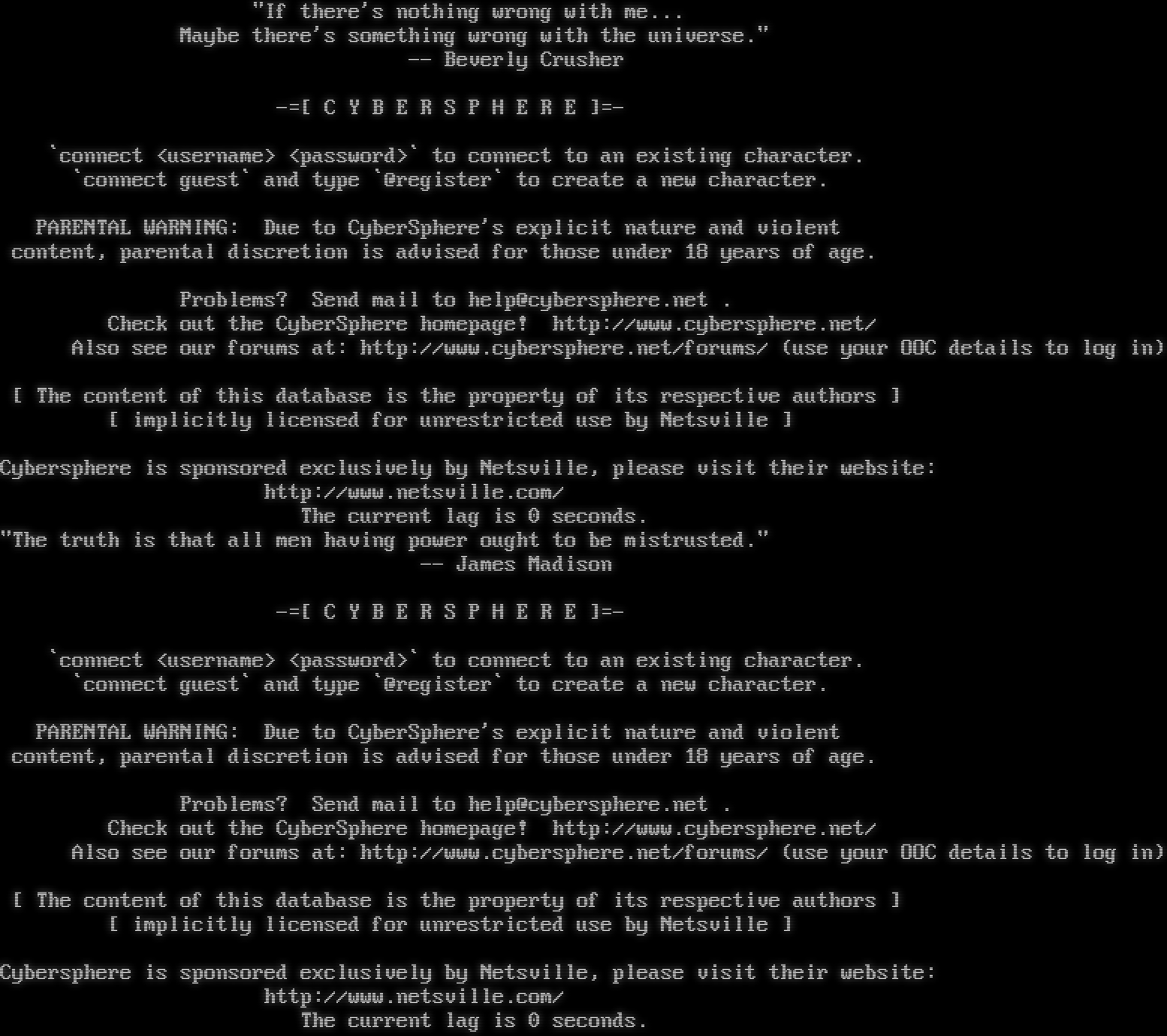 "If there's nothing wrong with me... Maybe there's something wrong with the universe." -- Beverly Crusher -=[ C Y B E R S P H E R E ]=- \`connect <username> <password>\` to connect to an existing character. \`connect guest\` and type \`@register\` to create a new character. PARENTAL WARNING: Due to CyberSphere's explicit nature and violent content, parental discretion is advised for those under 18 years of age. Problems? Send mail to help@cybersphere.net . Check out the CyberSphere homepage! http://www.cybersphere.net/ Also see our forums at: http://www.cybersphere.net/forums/ (use your OOC details to log in) [ The content of this database is the property of its respective authors ] [ implicitly licensed for unrestricted use by Netsville ] Cybersphere is sponsored exclusively by Netsville, please visit their website: http://www.netsville.com/ The current lag is 0 seconds. "The truth is that all men having power ought to be mistrusted." -- James Madison -=[ C Y B E R S P H E R E ]=- \`connect <username> <password>\` to connect to an existing character. \`connect guest\` and type \`@register\` to create a new character. PARENTAL WARNING: Due to CyberSphere's explicit nature and violent content, parental discretion is advised for those under 18 years of age. Problems? Send mail to help@cybersphere.net . Check out the CyberSphere homepage! http://www.cybersphere.net/ Also see our forums at: http://www.cybersphere.net/forums/ (use your OOC details to log in) [ The content of this database is the property of its respective authors ] [ implicitly licensed for unrestricted use by Netsville ] Cybersphere is sponsored exclusively by Netsville, please visit their website: http://www.netsville.com/ The current lag is 0 seconds.