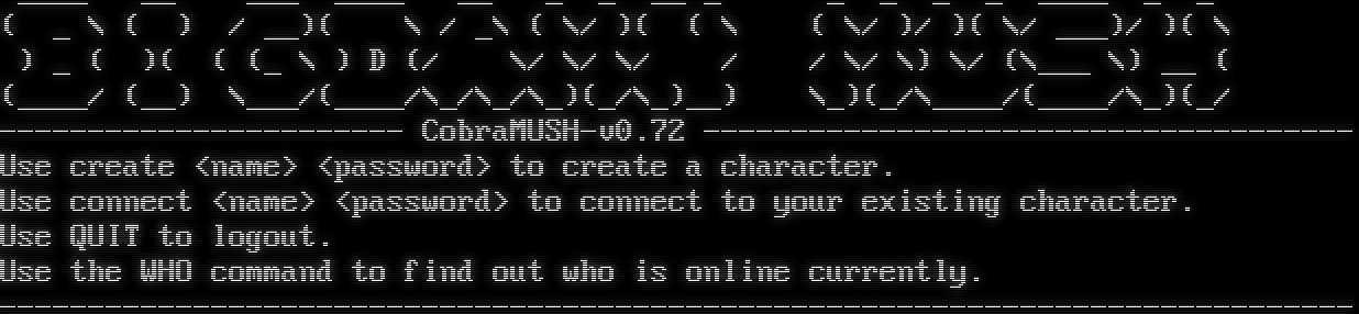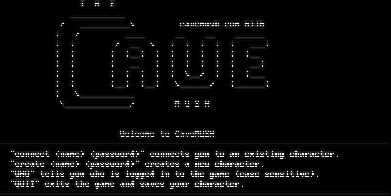 T H E _​__________ / _​_________\\ cavemush.com 6116 \| / _​___ __ __ _​_____ \| \| / __ \\ \| \| \| \| \| ___\| \| \| \| \|__\| \| \| \| \| \| \| \|__ \| \| \| __ \| \| \| \| \| \| __\| \| \| \| \| \| \| \| \\__/ \| \| \|___ \| \| \|__\| \|__\| \\_​_____/ \|_​_____\| \| \\_​__________ \\_​____________/ M U S H Welcome to CaveMUSH -​----------------------------------------------------------------------------- "connect <name> <password>" connects you to an existing character. "create <name> <password>" creates a new character. "WHO" tells you who is logged in to the game (case sensitive). "QUIT" exits the game and saves your character. -​-----------------------------------------------------------------------------