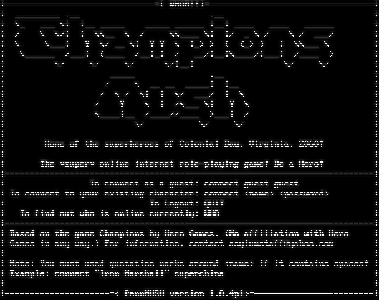 \|-​-----------------------------=[ WHAM!!]=​---------------------------------\| \| _​________ .__ .__ \| \| \\_ ___ \\\| \|__ _​____ _​____ _​_____ \|__\| _​___ _​___ _​_____ \| \| / \\ \\/\| \| \\\\__ \\ / \\\\_​___ \\\| \|/ _ \\ / \\ / ___/ \| \| \\ \\___\| Y \\/ __ \\\| Y Y \\ \|_> > ( <_> ) \| \\\\___ \\ \| \| \\_​_____ /___\| (_​___ /__\|_\| / __/\|__\|\\_​___/\|___\| /_​___ > \| \| \\/ \\/ \\/ \\/\|__\| \\/ \\/ \| \| _​____ .__ \| \| / \\ __ __ _​____\| \|__ \| \| / \\ / \\\| \| \\/ ___/ \| \\ \| \| / Y \\ \| /\\___ \\\| Y \\ \| \| \\_​___\|__ /_​___//_​___ >___\| / \| \| \\/ \\/ \\/ \| \| \| \| Home of the superheroes of Colonial Bay, Virginia, 2060! \| \| \| \| The \*super\* online internet role-playing game! Be a Hero! \| \|-​-------------------------------------------------------------------------\| \| To connect as a guest: connect guest guest \| \| To connect to your existing character: connect <name> <password> \| \| To Logout: QUIT \| \| To find out who is online currently: WHO \| \|-​-------------------------------------------------------------------------\| \| Based on the game Champions by Hero Games. (No affiliation with Hero \| \| Games in any way.) For information, contact asylumstaff@yahoo.com \| \| \| \| Note: You must used quotation marks around <name> if it contains spaces! \| \| Example: connect "Iron Marshall" superchina \| \| \| \|-​--------------------=< PennMUSH version 1.8.4p1>=​------------------------\|