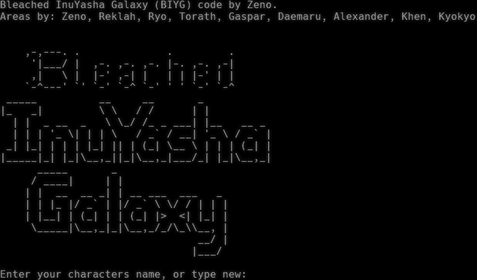 InuYasha & Bleach copyrighted content belongs to the respected companies & individuals. Bleached InuYasha Galaxy (BIYG) code by Zeno. Areas by: Zeno, Reklah, Ryo, Torath, Gaspar, Daemaru, Alexander, Khen, Kyokyo ,-,-​--. . . . '\|___/ \| ,-. ,-. ,-. \|-. ,-. ,-\| ,\| \\ \| \|-' ,-\| \| \| \| \|-' \| \| \`-​^---' \`' \`-' \`-^ \`-' ' ' \`-' \`-^ _​____ __ __ _ \|_ _\| \\ \\ / / \| \| \| \| _ __ _ \\ \\_/ /_ _ ___\| \|__ __ _ \| \| \| '_ \\\| \| \| \\ / _\` / __\| '_ \\ / _\` \| _\| \|_\| \| \| \| \|_\| \|\| \| (_\| \\__ \\ \| \| \| (_\| \| \|_​____\|_\| \|_\|\\__,_\|\|_\|\\__,_\|___/_\| \|_\|\\__,_\| _​____ _ / _​___\| \| \| \| \| __ __ _\| \| __ ___ ___ _ \| \| \|_ \|/ _\` \| \|/ _\` \\ \\/ / \| \| \| \| \|__\| \| (_\| \| \| (_\| \|> <\| \|_\| \| \\_​____\|\\__,_\|_\|\\__,_/_/\\_\\\\__, \| __/ \| \|___/ Enter your characters name, or type new: