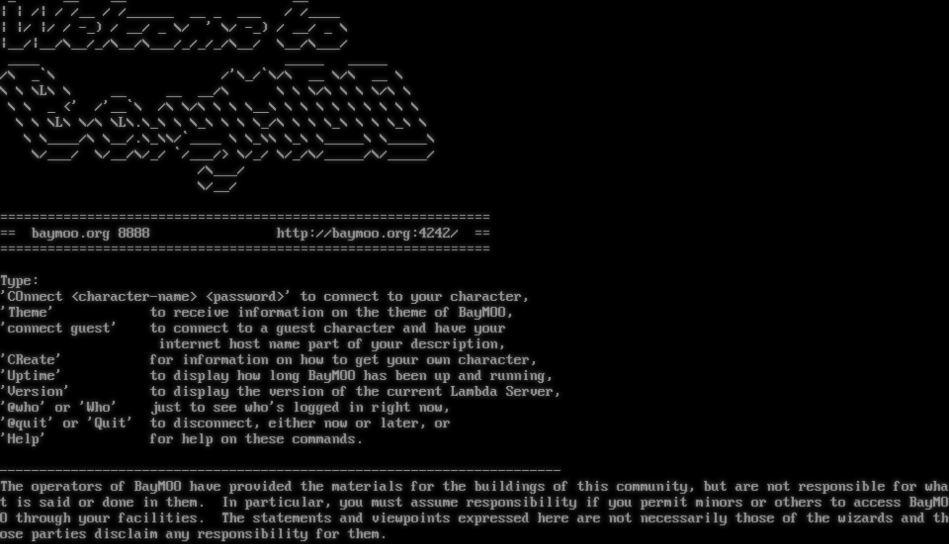 _ __ __ __ \| \| /\| / /__ / /_​_____ __ _ ___ / /_​___ \| \|/ \|/ / -_) / __/ _ \\/ ' \\/ -_) / __/ _ \\ \|__/\|__/\\__/_/\\__/\\___/_/_/_/\\__/ \\__/\\___/ _​___ _​____ _​____ /\\ _\`\\ /'\\_/\`\\/\\ __ \\/\\ __ \\ \\ \\ \\L\\ \\ __ __ __/\\ \\ \\ \\/\\ \\ \\ \\/\\ \\ \\ \\ _ <' /'__\`\\ /\\ \\/\\ \\ \\ \\__\\ \\ \\ \\ \\ \\ \\ \\ \\ \\ \\ \\ \\L\\ \\/\\ \\L\\.\\_\\ \\ \\_\\ \\ \\ \\_/\\ \\ \\ \\_\\ \\ \\ \\_\\ \\ \\ \\_​___/\\ \\__/.\\_\\\\/\`_​___ \\ \\_\\\\ \\_\\ \\_​____\\ \\_​____\\ \\/___/ \\/__/\\/_/ \`/___/> \\/_/ \\/_/\\/_​____/\\/_​____/ /\\___/ \\/__/ =​============================================================= == baymoo.org 8888 http://baymoo.org:4242/ == =​============================================================= Type: 'COnnect <character-name> <password>' to connect to your character, 'Theme' to receive information on the theme of BayMOO, 'connect guest' to connect to a guest character and have your internet host name part of your description, 'CReate' for information on how to get your own character, 'Uptime' to display how long BayMOO has been up and running, 'Version' to display the version of the current Lambda Server, '@who' or 'Who' just to see who's logged in right now, '@quit' or 'Quit' to disconnect, either now or later, or 'Help' for help on these commands. -​---------------------------------------------------------------------- The operators of BayMOO have provided the materials for the buildings of this community, but are not responsible for what is said or done in them. In particular, you must assume responsibility if you permit minors or others to access BayMOO through your facilities. The statements and viewpoints expressed here are not necessarily those of the wizards and those parties disclaim any responsibility for them.