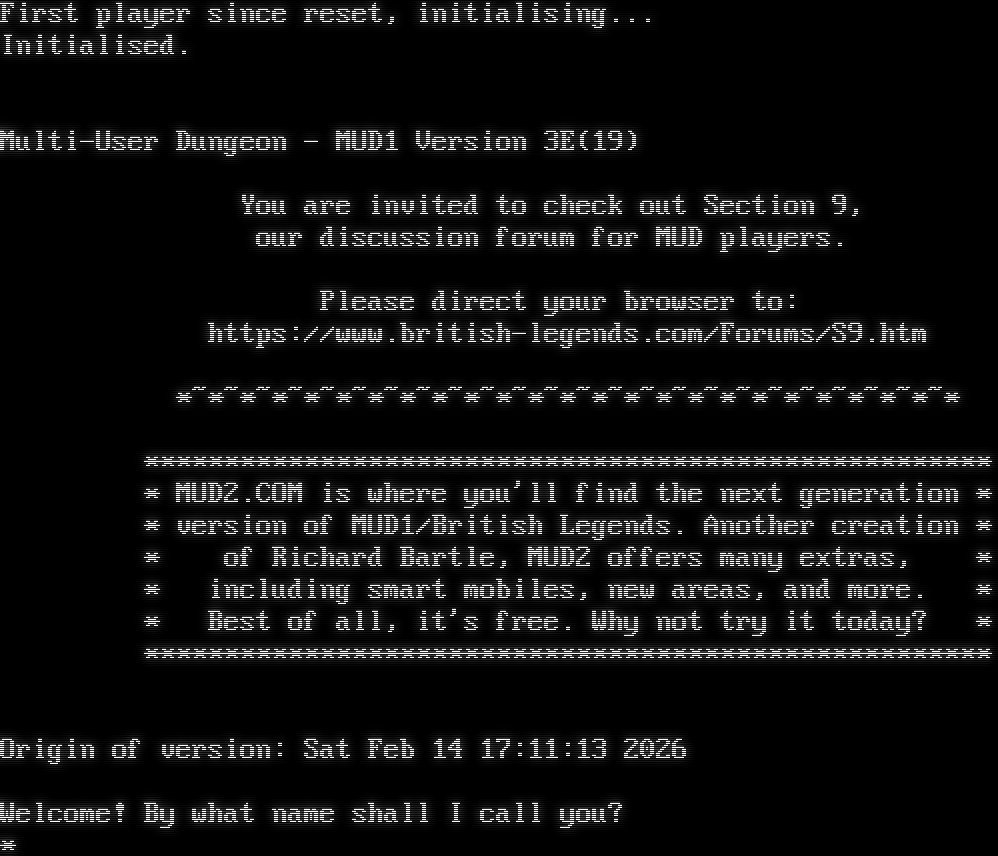 First player since reset, initialising... Initialised. Multi-User Dungeon - MUD1 Version 3E(19) You are invited to check out Section 9, our discussion forum for MUD players. Please direct your browser to: https://www.british-legends.com/Forums/S9.htm \*~\*~\*~\*~\*~\*~\*~\*~\*~\*~\*~\*~\*~\*~\*~\*~\*~\*~\*~\*~\*~\*~\*~\*~\* \*\*\*\*\*\*\*\*\*\*\*\*\*\*\*\*\*\*\*\*\*\*\*\*\*\*\*\*\*\*\*\*\*\*\*\*\*\*\*\*\*\*\*\*\*\*\*\*\*\*\*\*\* \* MUD2.COM is where you'll find the next generation \* \* version of MUD1/British Legends. Another creation \* \* of Richard Bartle, MUD2 offers many extras, \* \* including smart mobiles, new areas, and more. \* \* Best of all, it's free. Why not try it today? \* \*\*\*\*\*\*\*\*\*\*\*\*\*\*\*\*\*\*\*\*\*\*\*\*\*\*\*\*\*\*\*\*\*\*\*\*\*\*\*\*\*\*\*\*\*\*\*\*\*\*\*\*\* Origin of version: Sat Feb 14 17:11:13 2026 Welcome! By what name shall I call you? \*