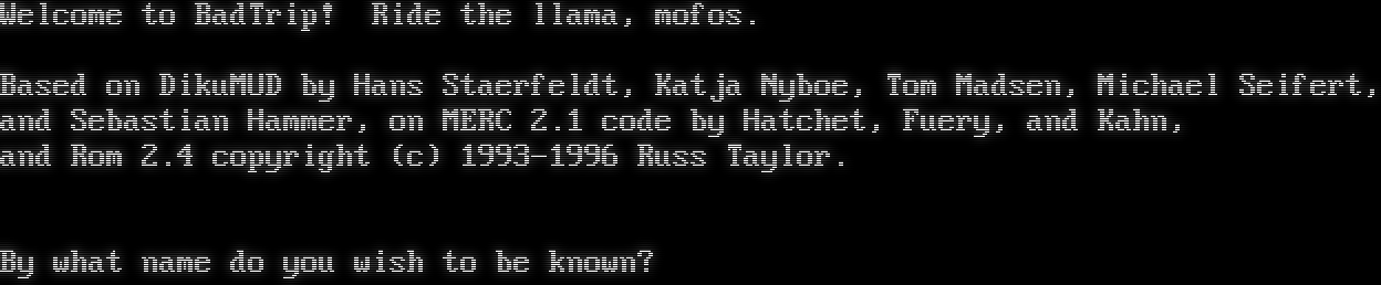 Welcome to BadTrip! Ride the llama, mofos. Based on DikuMUD by Hans Staerfeldt, Katja Nyboe, Tom Madsen, Michael Seifert, and Sebastian Hammer, on MERC 2.1 code by Hatchet, Fuery, and Kahn, and Rom 2.4 copyright (c) 1993-1996 Russ Taylor. By what name do you wish to be known?