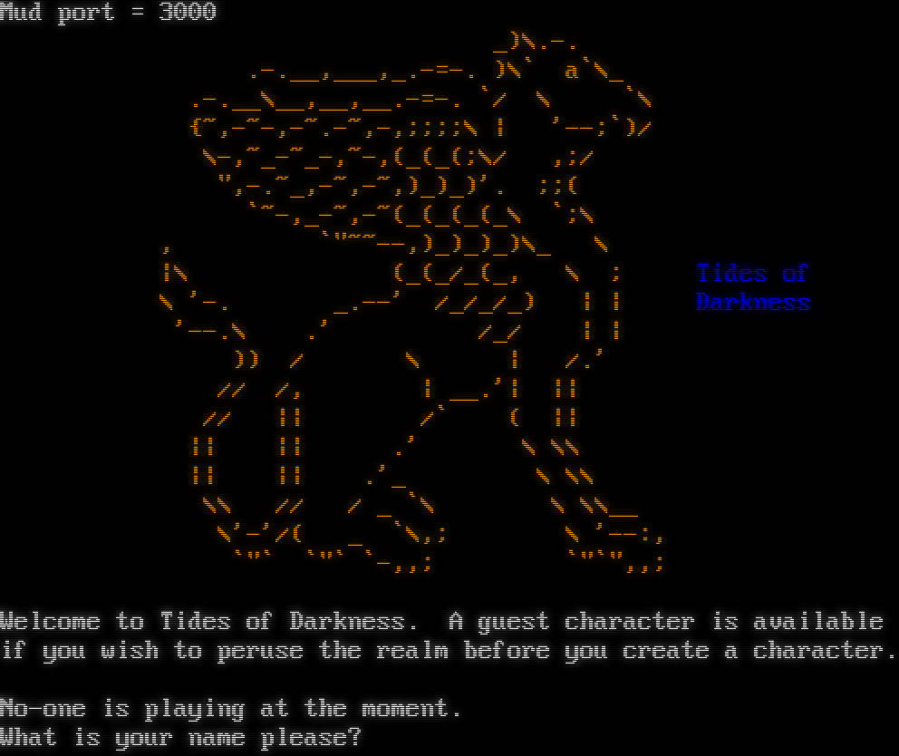 Mud port = 3000 _)\\.-. .​-.__,___,_​.-=-. )\\\` a\`\\_ .​-.__\\__,__,_​_.-=-. \`/ \\ \`\\ {~,-~-,-​~.-~,-,;;;;\\ \| '--;\`)/ \\-,~​_-~_-,~-,(_(_(;\\/ ,;/ ",-​.~_,-~,-~,)_)_)'. ;;( \`~-,_-~,-~(_(_(_(_\\ \`;\\ , \`"​~~--,)_)_)_)\\_ \\ \|\\ (_(_/_(_, \\ ; Tides of \\ '-. _​.--' /_/_/_) \| \| Darkness '--.\\ .' /_/ \| \| )) / \\ \| /.' // /, \| __.'\| \|\| // \|\| /\` ( \|\| \|\| \|\| .' \\ \\\\ \|\| \|\| .'_ \\ \\\\ \\\\ // / _ \`\\ \\ \\\\__ \\'-'/( _ \`\\,; \\ '--:, \`"\` \`"\` \`-,,; \`"\`",,; Welcome to Tides of Darkness. A guest character is available if you wish to peruse the realm before you create a character. No-one is playing at the moment. What is your name please?