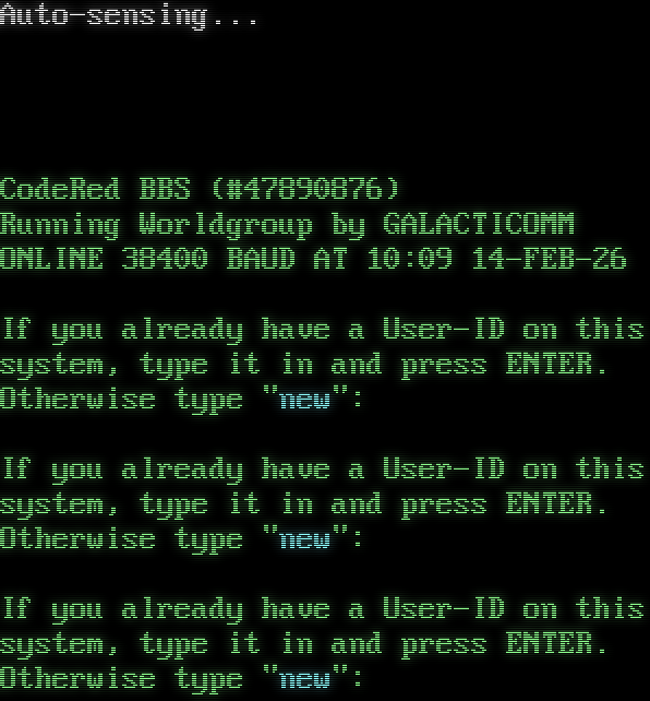 Auto-sensing...  !  WELCOME! CodeRed BBS (#47890876) Running Worldgroup by GALACTICOMM ONLINE 38400 BAUD AT 10:09 14-FEB-26 If you already have a User-ID on this system, type it in and press ENTER. Otherwise type "new": If you already have a User-ID on this system, type it in and press ENTER. Otherwise type "new": If you already have a User-ID on this system, type it in and press ENTER. Otherwise type "new":