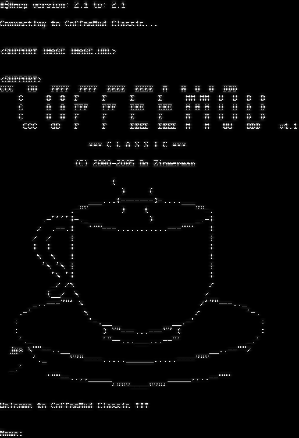 #$#mcp version: 2.1 to: 2.1 Connecting to CoffeeMud Classic... <SUPPORT IMAGE IMAGE.URL> <SUPPORT> CCC OO FFFF FFFF EEEE EEEE M M U U DDD C O O F F E E MM MM U U D D C O O FFF FFF EEE EEE M M M U U D D C O O F F E E M M U U D D CCC OO F F EEEE EEEE M M UU DDD v4.1 \*\*\* C L A S S I C \*\*\* (C) 2000-2005 Bo Zimmerman ( ) ( _​__...(-​------)-​....___ .-&quot;&quot; ) ( &quot;&quot;-. .-''''\|-._ ) _.-\| / .​--.\| '&quot;&quot;-​--...........---&quot;&quot;' \| / / \| \| \| \| \| \| \\ \\ \| \| '\\ '\\ \| \| '\\ '\| \| _/ /\\ / (__/ \\ / _​..---&quot;&quot;' \\ /'&quot;&quot;-​--.._ .-' \\ / '-. : '-​.__ _​_.-' : : ) &quot;&quot;-​--...---&quot;&quot; ( : '._ '&quot;-​-...___...--&quot;' _.' jgs \\&quot;&quot;-​-..__ _​_..--&quot;&quot;/ '._ &quot;&quot;&quot;-​---.....______.....----&quot;&quot;&quot; _.' '&quot;&quot;-​-..,,_​____ _​____,,.​.--&quot;&quot;' '&quot;&quot;&quot;-​---&quot;&quot;&quot;' Welcome to CoffeeMud Classic !!! Name: