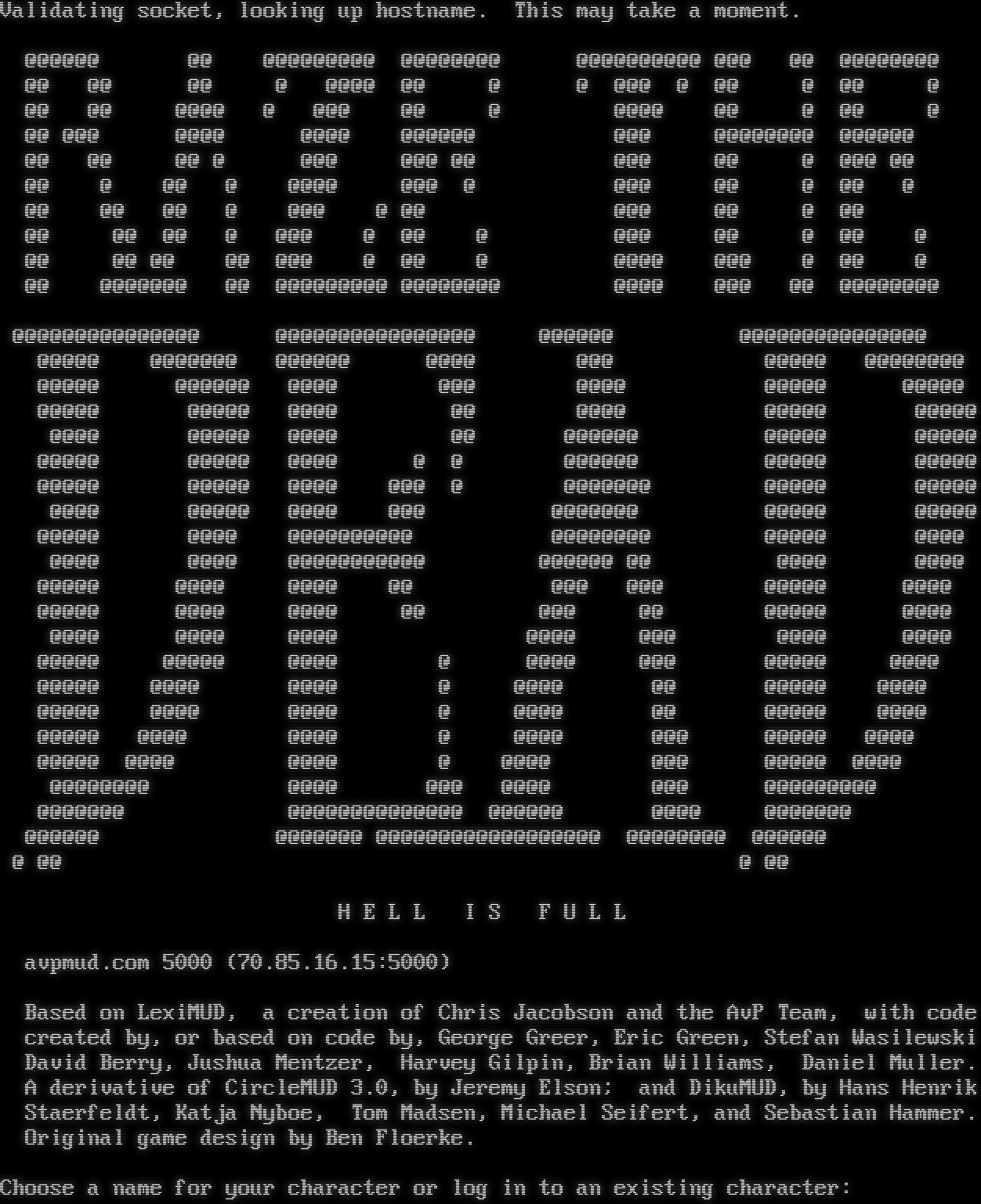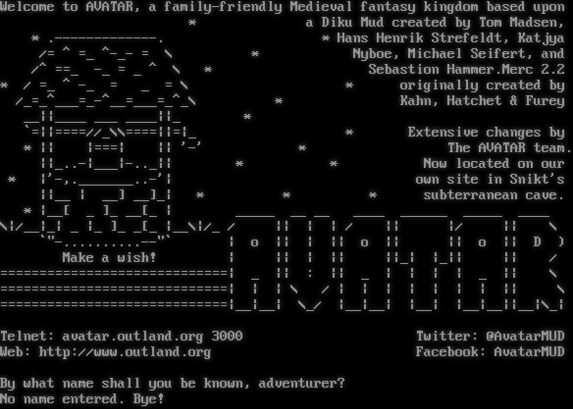 Welcome to AVATAR, a family-friendly Medieval fantasy kingdom based upon \* a Diku Mud created by Tom Madsen, \* .​-------------. \* Hans Henrik Strefeldt, Katjya /= ^ =_ ^​-_- = \\ \* Nyboe, Michael Seifert, and /^ ==_ -_ = _ ^ \\ \* Sebastion Hammer.Merc 2.2 \* / =_ ^ -_ = _ = \\ \* originally created by /_​=_^___=_-^__=___=_^_\\ \* Kahn, Hatchet & Furey __\|\|_​___ ___ _​___\|\|_ \* \`=\|\|=​===//_\\\\=​===\|\|=\|_ \* Extensive changes by \* \|\| \|===\| \|\| '-' \* The AVATAR team. \|\|_​..-\|___\|-​.._\|\| \* \* Now located on our \* \|'-,.​_______..-'\| own site in Snikt's \|\|__ \| __] __]_\| \* \* \* subterranean cave. \* \|__[ _ ]_ __[_ \| _​____ __ __ _​___ _​_____ _​____ _​___ \\\|/__\|_\| _ \|_ ]_ _[_ \|__\\\|/_ / \|\| \| \| / \|\| \|/ \|\| \\ \`"​-..........--"\` \| o \|\| \| \|\| o \|\| \|\| o \|\| D ) Make a wish! \| \|\| \| \|\| \|\|_\| \|_\|\| \|\| / =​============================\| _ \|\| : \|\| _ \| \| \| \| _ \|\| \\ =​============================\| \| \| \\ / \| \| \| \| \| \| \| \|\| \\ =​============================\|__\|__\| \\_/ \|__\|__\| \|__\| \|__\|__\|\|__\|\\_\| Telnet: avatar.outland.org 3000 Twitter: @AvatarMUD Web: http://www.outland.org Facebook: AvatarMUD By what name shall you be known, adventurer? No name entered. Bye!