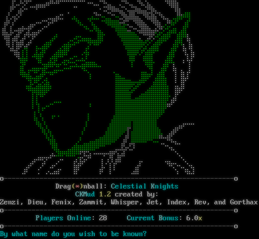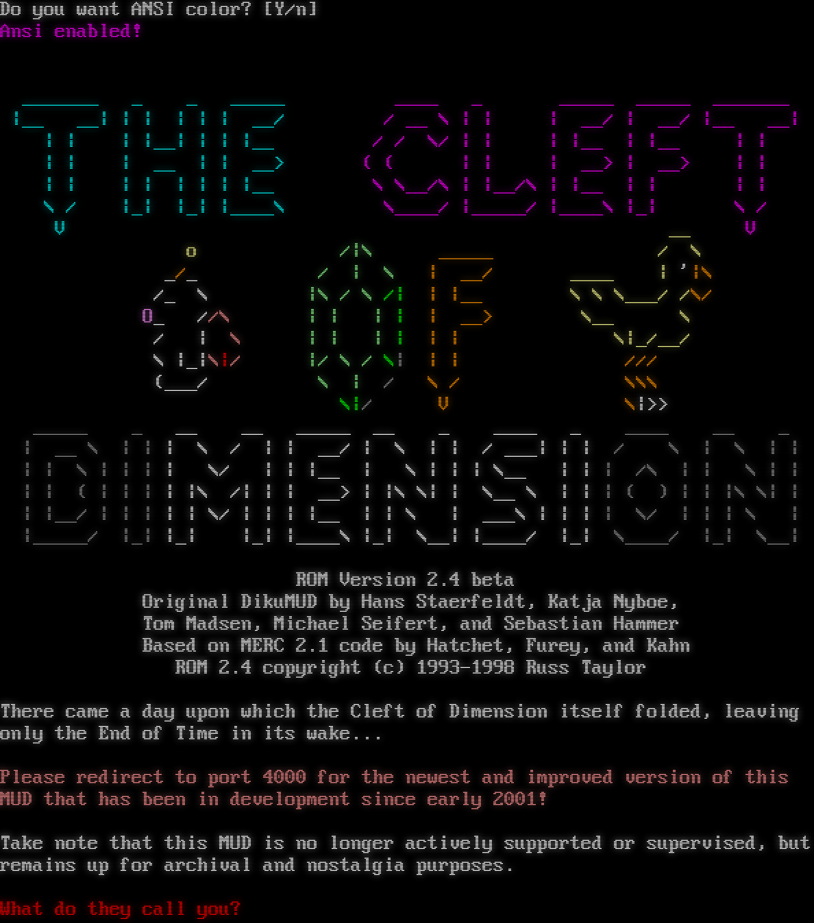 Do you want ANSI color? [Y/n] Ansi enabled! _​______ _ _ _​____ _​___ _ _​____ _​____ _​______ \|__ __\| \| \| \| \| \| __/ / __ \\ \| \| \| __/ \| __/ \|__ __\| \| \| \| \|__\| \| \| \|__ / / \\/ \| \| \| \|__ \| \|__ \| \| \| \| \| __ \| \| __> ( ( \| \| \| __> \| __> \| \| \| \| \| \| \| \| \| \|__ \\ \\__/\\ \| \|__/\\ \| \|__ \| \| \| \| \\ / \|_\| \|_\| \|_​___\\ \\_​___/ \|_​____/ \|_​___\\ \|_\| \\ / V __ V o /\|\\ _​____ / \\ _/_ / \| \\ \| __/ _​___ \| '\|\\ /_ \\ \|\\ / \\ /\| \| \|__ \\ \\ \\___/ /\\/ O_ //\\ \| \| \| \| \| __> \\__ \\ / \| \\ \| \| \| \| \| \| \\\|_/__/ \\ \|_\|\\\|/ \|/ \\ / \\\| \| \| /// (___/ \\ \| / \\ / \\\\\\ \\\|/ V \\\|>> _​____ _ __ __ _​____ __ _ _​___ _ _​___ __ _ \| __ \\ \| \| \| \\ / \| \| __/ \| \\ \| \| / ___\| \| \| / \\ \| \\ \| \| \| \| \\ \| \| \| \| \\/ \| \| \|__ \| \\ \| \| \| \\__ \| \| \| /\\ \| \| \\ \| \| \| \| ( \| \| \| \| \|\\ /\| \| \| __> \| \|\\ \\\| \| \\__ \\ \| \| \| ( ) \| \| \|\\ \\\| \| \| \|__/ \| \| \| \| \| \\/ \| \| \| \|__ \| \| \\ \| ___\\ \| \| \| \| \\/ \| \| \| \\ \| \|_​____/ \|_\| \|_\| \|_\| \|_​___\\ \|_\| \\__\| \|_​___/ \|_\| \\_​___/ \|_\| \\__\| ROM Version 2.4 beta Original DikuMUD by Hans Staerfeldt, Katja Nyboe, Tom Madsen, Michael Seifert, and Sebastian Hammer Based on MERC 2.1 code by Hatchet, Furey, and Kahn ROM 2.4 copyright (c) 1993-1998 Russ Taylor There came a day upon which the Cleft of Dimension itself folded, leaving only the End of Time in its wake... Please redirect to port 4000 for the newest and improved version of this MUD that has been in development since early 2001! Take note that this MUD is no longer actively supported or supervised, but remains up for archival and nostalgia purposes. What do they call you?