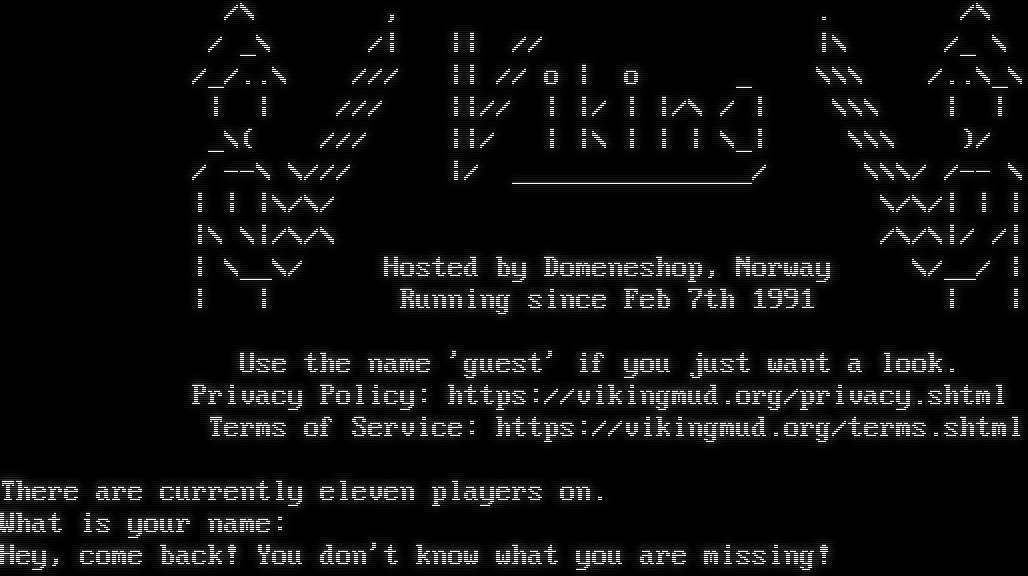 /\\ , . /\\ / _\\ /\| \|\| // \|\\ /_ \\ /_/..\\ /// \|\| // o \| o _ \\\\\\ /..\\_\\ \| \| /// \|\|// \| \|/ \| \|/\\ / \| \\\\\\ \| \| _\\( /// \|\|/ \| \|\\ \| \| \| \\_\| \\\\\\ )/ / --\\ \\/// \|/ _​______________/ \\\\\\/ /-- \\ \| \| \|\\/\\/ \\/\\/\| \| \| \|\\ \\\|/\\/\\ /\\/\\\|/ /\| \| \\__\\/ Hosted by Domeneshop, Norway \\/__/ \| \| \| Running since Feb 7th 1991 \| \| Use the name 'guest' if you just want a look. Privacy Policy: https://vikingmud.org/privacy.shtml Terms of Service: https://vikingmud.org/terms.shtml There are currently eleven players on. What is your name: Hey, come back! You don't know what you are missing!