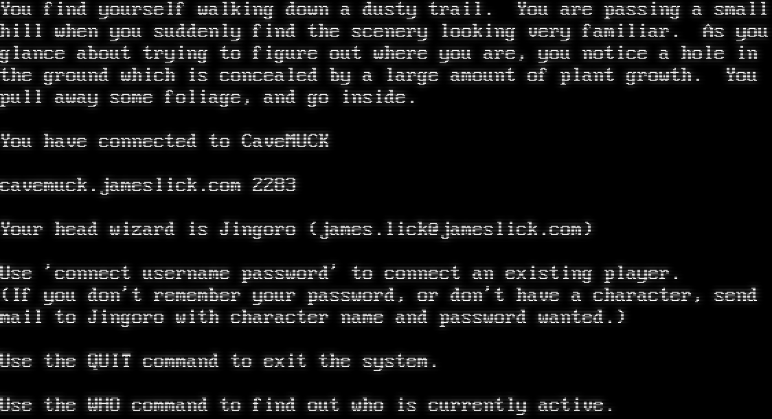 You find yourself walking down a dusty trail. You are passing a small hill when you suddenly find the scenery looking very familiar. As you glance about trying to figure out where you are, you notice a hole in the ground which is concealed by a large amount of plant growth. You pull away some foliage, and go inside. You have connected to CaveMUCK cavemuck.jameslick.com 2283 Your head wizard is Jingoro (james.lick@jameslick.com) Use 'connect username password' to connect an existing player. (If you don't remember your password, or don't have a character, send mail to Jingoro with character name and password wanted.) Use the QUIT command to exit the system. Use the WHO command to find out who is currently active.