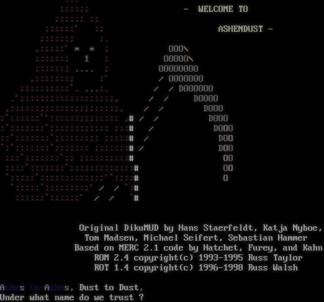 ... ;::::; - WELCOME TO ;::::; :; ;:::::' :; ASHENDUST - ;:::::; ;. ,:::::' \* \* ; OOO\\ ::::::; 1 ; OOOOO\\ ;:::::; .​... ; OOOOOOOO ,;::::::; ;' / OOOOOOO ;:::::::::\`. ,,,;. / / DOOOOOO .';:::::::::::::::::;, / / DOOOO ,::::::;::::::;;;;::::;, / / DOOO ;\`::::::\`'::::::;;;::::: ,# / / DOOO :\`:::::::\`;::::::;;::: ;::# / DOOO ::\`:::::::\`;:::::::: ;::::# / DOO \`:\`:::::::\`;:::::: ;::::::# / DOO :::\`:::::::\`;; ;:::::::::# OO ::::\`:::::::\`;::::::::;:::# OO \`:::::\`::::::::::::;'\`:;::# O . \`:::::\`::::::::;' / / \`:# : ::::::\`:::::;' / / \`# ; Original DikuMUD by Hans Staerfeldt, Katja Nyboe, Tom Madsen, Michael Seifert, Sebastian Hammer Based on MERC 2.1 code by Hatchet, Furey, and Kahn ROM 2.4 copyright(c) 1993-1995 Russ Taylor ROT 1.4 copyright(c) 1996-1998 Russ Walsh Ashes to Ashes, Dust to Dust, Under what name do we trust ?