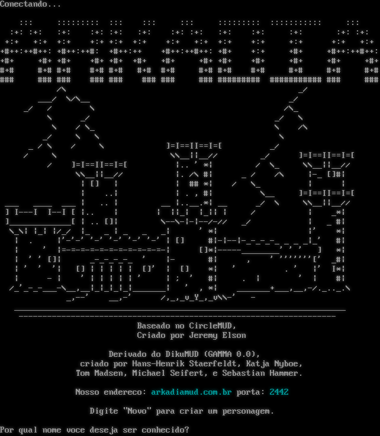 Conectando... ::: ::::::::: ::: ::: ::: ::::::::: ::::::::::: ::: :+: :+: :+: :+: :+: :+: :+: :+: :+: :+: :+: :+: :+: +:+ +:+ +:+ +:+ +:+ +:+ +:+ +:+ +:+ +:+ +:+ +:+ +:+ +​#++:+​+#++: +​#++:++#: +​#++:++ +​#++:+​+#++: +#+ +:+ +#+ +​#++:+​+#++: +#+ +#+ +#+ +#+ +#+ +#+ +#+ +#+ +#+ +#+ +#+ +#+ +#+ #+# #+# #+# #+# #+# #+# #+# #+# #+# #+# #+# #+# #+# ### ### ### ### ### ### ### ### #​######## #​########## ### ### /\\ _/ ___/ \\/\\__ _/ _/ / \\ /\\_ \\ _/ _/ \\ \\ / \\_ \\ /\\ _/ \\ \\ \\ _ / \\ / \\ ]=I==II==I=[ _/ / \\ \\\\__\|\|__// _/ ]=I==II==I=[ / ]=I==II==I=[ \|.. ' \*\| / \\_ \\\\__\|\|__// \\\\__\|\|__// \|. /\\ #\| _ / /\\ \|-_ []#\| \| [] \| \| ## \*\| / \\_ \| \| \| ..\| \| . , #\| \\__ ]=I==II==I=[ ___ _​___ ___ \| .. \| __ \|.​.__.\*\| __ _/ \\ \\\\__\|\|__// ] I---I I--I [ \|.. \| \| \|\|_\| \|_\|\| \| / \| _\*\| ]_​____________[ \| .. []\| \\--\\-\|-\|--/-// _/ \| _ #\| \\_\\\| \|_\| \|/_/ \|_ _ \| _ _ _\| ' \*\| \|' \*\| \| . \|'-'-' '-' '-' '-' '-' \| [] #\|-\|--\|-​_-_-_-_ _ _ _\|_' #\| \| ' \|=​-=-=-=-=-=-=-=-=-=-=-\| []\*\|-​----________' ' ' ] \*\| \| ' ' []\| _​-_-_-_-_ ' \|- #\| , ' '''''''[' _#\| \| ' ' '\| [] \| \| \| \| \| []' \| [] \*\| ' . ' \|' I\*\| \| - \| ' \| \| \| \| \| ' \| ; ' #\| . \| ' \| #\| /_'_​-_-___-\\__,__\|_\|_\|_\|_\|_​______\| ' , \*\| _​______+___,__,-/.​_.._.\\ _,--' __,-' /,_,_v_Y_,_v\\\\-' - _​_____________________________________________________________________ -​------------------------------------------------------------------ Baseado no CircleMUD, Criado por Jeremy Elson Derivado do DikuMUD (GAMMA 0.0), criado por Hans-Henrik Staerfeldt, Katja Nyboe, Tom Madsen, Michael Seifert, e Sebastian Hammer. Nosso endereco: arkadiamud.com.br porta: 2442 Digite "Novo" para criar um personagem. Por qual nome voce deseja ser conhecido?