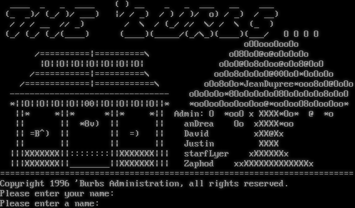 _​___ _ _ _​___ ( ) __ _ _ ___ __ ___ (_ _)/ (_/ )/ ___) \|/ / _) / ) / )/ o) / _) / __) / / / __ // _) / \\ / (_/ // \\/ / \\ (_ ) (_/ (_/ (_/(_​___) (_​___)(_​____/(_/\\_)(_​___)(___/ O O O O oOOoooOooOo /=​=========\|=​=========\\ oO8OoO@o@oOoOoOo \|O\|\|O\|\|O\|\|O\|\|O\|\|O\|\|O\| oOoO@Oo8oOoo@oOo8@OoO /=​==========\|=​=========\\ ooOo8oOoOoO@00OoO\*OoOoOo /=​============\|=​===========\\ oOo8oOo\*JeanDupree\*ooo8oO@OoOo -​------------------------------- oOoOoOo\*8OoOoOoOoO8OoOoOoOo8oOoO \*\|\|O\|\|O\|\|O\|\|O\|\|00\|\|O\|\|O\|\|O\|\|O\|\|\* \*ooOooOooOooOoo@\*ooOooO8oOooOoo\* \|\|\* \*\|\|\* \*\|\|\* \*\|\| Admin: O \*ooO x XXXX\*Oo\* @ \*o \|\| \|\| \*8v) \|\| \|\| anDrea Oo xXXXX\*oo \|\| =B^) \|\| \|\| =) \|\| David xXX@Xx \|\| \|\| \|\| \|\| Justin XXXX \|\|\|XXXXXXX\|\|::::::::\|\|XXXXXXX\|\|\| starfLyer xXXXXXXx \|\|\|XXXXXXX\|\|_​_______\|\|XXXXXXX\|\|\| Zaphod xxXXXXXXXXXXXXXx =​====================================================================== Copyright 1996 'Burbs Administration, all rights reserved. Please enter your name: Please enter a name: