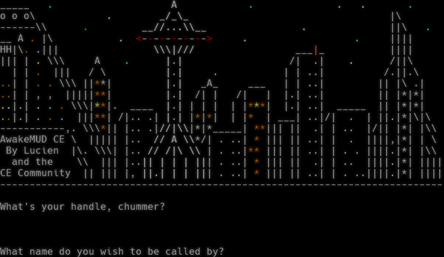 Administration Email: luciensadi@gmail.com Credit to Jeremy Elson, Hans Henrik Staerfeldt, Katja Nyboe, Tom Madsen, Michael Seifert, and Sebastian Hammer for their work on predecessor games. Forked from AwakeMUD 0.8.20 BETA, by Flynn, Fastjack, Rift, Washu, and Che. This is AwakeMUD Community Edition 0.9, by Lucien, Finster, Vile, and the community. _​____ . A . . . . o o o\\ . _/_\\_ \|\\ -​-----\\\\ . __//...\\\\__ . \|\|\\ . __ A . \|\\ . <-​----------> . . \|\|\|\| HH\|\\. .\|\|\| \\\\\\\|/// ___\|_ \|\|\|\| \|\|\| \| . \\\\\\ A . \|.\| /\| .\| . /\|\|\\ \| \| . \|\|\| / \\ \|.\| . \| \| ..\| /.\|\|.\\ ..\| \| . . \\\\\\ \|\|\*\*\| \|.\| _A_ ___ \| \| ..\| \|\| \|\\ .\| ..\| \| , , \|\|\|\|\|\*\*\| \|.\| /\| \| /\| \| \|.\| ..\| \|\| \|\*\|\*\| ..\|.\| . . . \\\\\\\|\*\*\|. _​___ \|.\| \| \| \| \| \|\*\*\*\| \|.\| ..\| _​____ \|\| \|\*\|\*\| ..\|.\| . . . \|\|\|\*\*\| /\|.. .\| \|.\| \|\*\|\*\| \| \|\* \| ___\| ..\|/\| . \| \|\|.\|\*\|\\\|\\ -​----------,. \\\\\\\*\|\| \|.. .\|//\|\\\\\|\*\|\*_​____\| \*\*\|\|\| \|\| .\| \| .. \|/\|\| \|\*\| \|\\\\ AwakeMUD CE \\ \|\|\|\|\| \|.. // A \\\\\*/\| . ..\| \* \|\|\| \|\| ..\| \| . \|\|\|\|,\|\*\| \| \\ By Lucien \|\\. \\\\\\\| \|.. // /\|\\ \\\\ \| . ..\|\*\* \|\|\| \|\| ..\| \| . . \|\|\|\|.\|\*\| \|\\\\ and the \\\\ \|\|\| \|..\|\| \| \| \| \|\|\| . ..\| \* \|\|\| \|\| .\| \| .. \|\|\|\|.\|\*\| \|\|\|\| CE Community \|\| \|\|\| \|, \|\|.\| \| \| \|\|\| . ..\| \* \|\|\| \|\| ..\| \| . ..\|\|\|\|.\|\*\| \|\|\|\| -​-------------------------------------------------------------------------- What's your handle, chummer? What name do you wish to be called by?