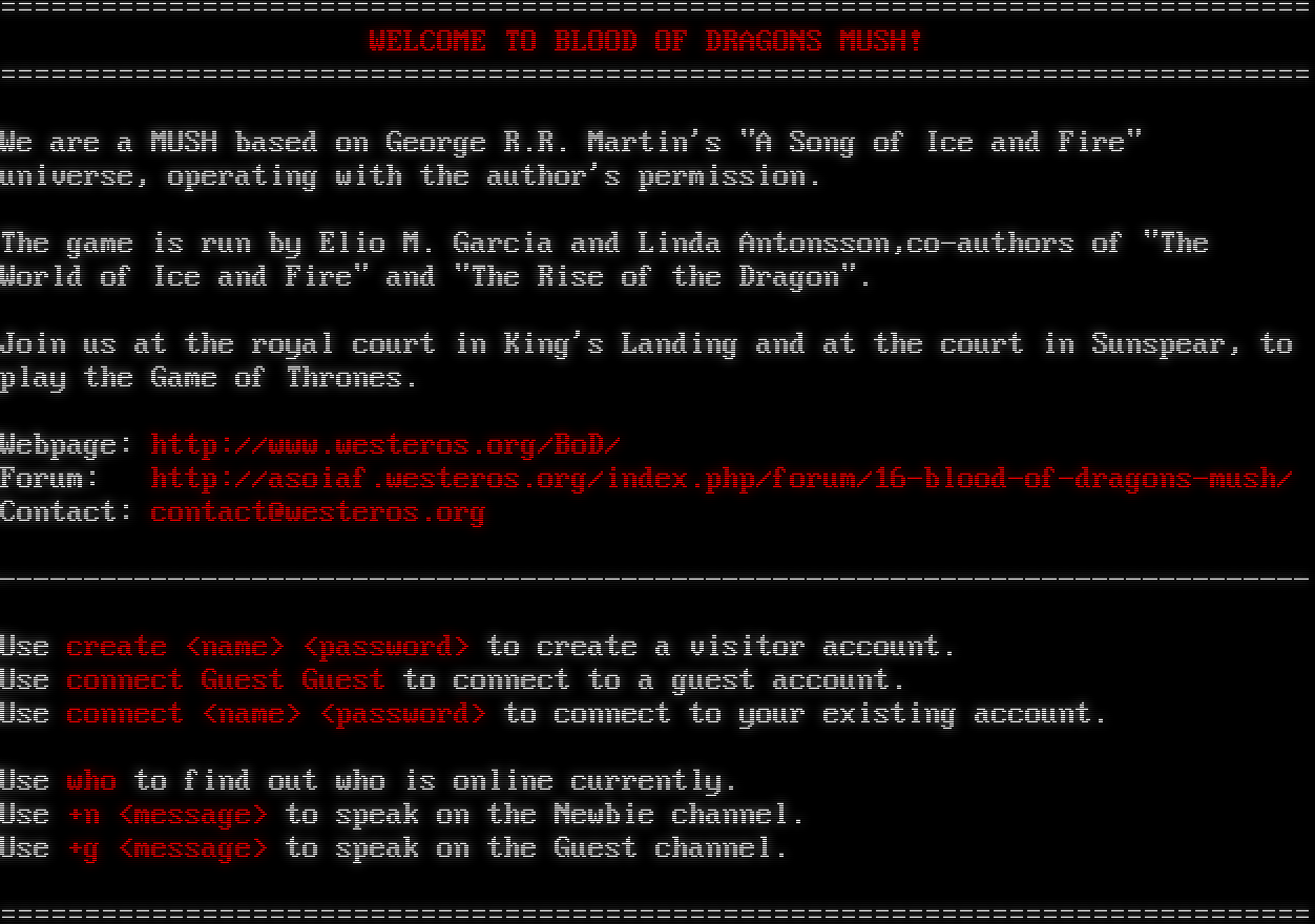 =​============================================================================= WELCOME TO BLOOD OF DRAGONS MUSH! =​============================================================================= We are a MUSH based on George R.R. Martin's "A Song of Ice and Fire" universe, operating with the author's permission. The game is run by Elio M. Garcia and Linda Antonsson,co-authors of "The World of Ice and Fire" and "The Rise of the Dragon". Join us at the royal court in King's Landing and at the court in Sunspear, to play the Game of Thrones. Webpage: http://www.westeros.org/BoD/ Forum: http://asoiaf.westeros.org/index.php/forum/16-blood-of-dragons-mush/ Contact: contact@westeros.org -​----------------------------------------------------------------------------- Use create <name> <password> to create a visitor account. Use connect Guest Guest to connect to a guest account. Use connect <name> <password> to connect to your existing account. Use who to find out who is online currently. Use +n <message> to speak on the Newbie channel. Use +g <message> to speak on the Guest channel. =​=============================================================================