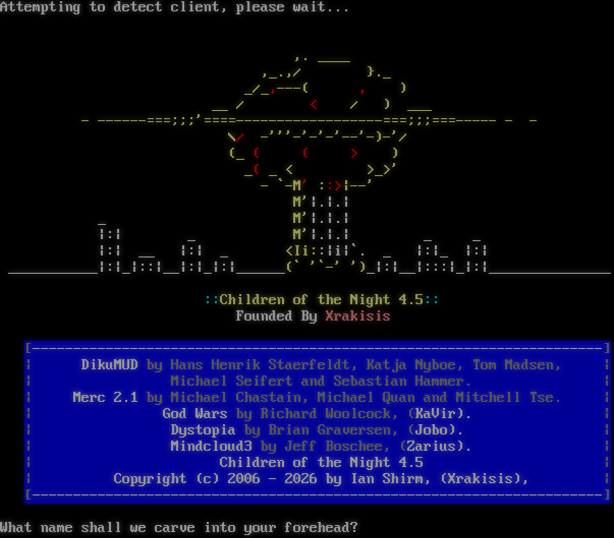 Attempting to detect client, please wait... ,. _​___ ,_.,/ }._ _/_,---( , ) __ / < / ) ___ - -​-----===;;;'=​===------------------===;;;=​==----- - - \\/ -'''-'-'-'--'-)-'/ (_ ( ( > ) _( _ < >_>' - \`-M' ::>\|--' M'\|.\|.\| _ M'\|.\|.\| \|:\| _ M'\|.\|.\| _ _ \|:\| __ \|:\| _ <Ii::\|i\|\`. _ \|:\|_ \|:\| _​__________\|:\|_\|::\|__\|:\|_\|:\|_​_____(\` '\`-' ')_\|:\|__\|:::\|_\|:\|_​______________ ::Children of the Night 4.5:: Founded By Xrakisis [-​---------------------------------------------------------------------] \| DikuMUD by Hans Henrik Staerfeldt, Katja Nyboe, Tom Madsen, \| \| Michael Seifert and Sebastian Hammer. \| \| Merc 2.1 by Michael Chastain, Michael Quan and Mitchell Tse. \| \| God Wars by Richard Woolcock, (KaVir). \| \| Dystopia by Brian Graversen, (Jobo). \| \| Mindcloud3 by Jeff Boschee, (Zarius). \| \| Children of the Night 4.5 \| \| Copyright (c) 2006 - 2026 by Ian Shirm, (Xrakisis), \| [-​---------------------------------------------------------------------] What name shall we carve into your forehead?