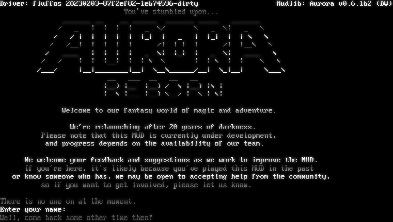 Driver: fluffos 20230203-87f2ef82-1e674596-dirty Mudlib: Aurora v0.6.1b2 (DW) You've stumbled upon... _​______ __ __ _​_____ _​______ _​____ _​______ / _ \| \| \| \| _ \\/ \\ _ \\\| _ \\ / / \| \| \| \| \| \|_\| \| _ \| \|_\| \| \| \\ \\ / /__\| \| \| \| \| /\| \| \| \| /\| \|__\\ \\ / _​___ \| \| \| \| _ \\\| \|_\| \| _ \\\| _​___ \\ / / \| \| \|__\| \| \| \\ \\ \| \| \\ \| \| \\ \\ /___/ \|__\|_​_______\|__\| \\__\\_​_____/__\| \\_\|__\| \\___\\ __ ___ __ __ __ \|__) \|__ \|__) / \\ \|__) \|\\ \| \| \\ \|___ \|__) \\__/ \| \\ \| \\\| Welcome to our fantasy world of magic and adventure. We're relaunching after 20 years of darkness. Please note that this MUD is currently under development, and progress depends on the availability of our team. We welcome your feedback and suggestions as we work to improve the MUD. If you're here, it's likely because you've played this MUD in the past or know someone who has, we may be open to accepting help from the community, so if you want to get involved, please let us know. There is no one on at the moment. Enter your name: Well, come back some other time then!