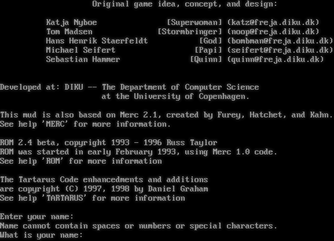 Original game idea, concept, and design: Katja Nyboe [Superwoman] (katz@freja.diku.dk) Tom Madsen [Stormbringer] (noop@freja.diku.dk) Hans Henrik Staerfeldt [God] (bombman@freja.diku.dk) Michael Seifert [Papi] (seifert@freja.diku.dk) Sebastian Hammer [Quinn] (quinn@freja.diku.dk) Developed at: DIKU -- The Department of Computer Science at the University of Copenhagen. This mud is also based on Merc 2.1, created by Furey, Hatchet, and Kahn. See help 'MERC' for more information. ROM 2.4 beta, copyright 1993 - 1996 Russ Taylor ROM was started in early February 1993, using Merc 1.0 code. See help 'ROM' for more information The Tartarus Code enhancedments and additions are copyright (C) 1997, 1998 by Daniel Graham See help 'TARTARUS' for more information Enter your name: Name cannot contain spaces or numbers or special characters. What is your name: