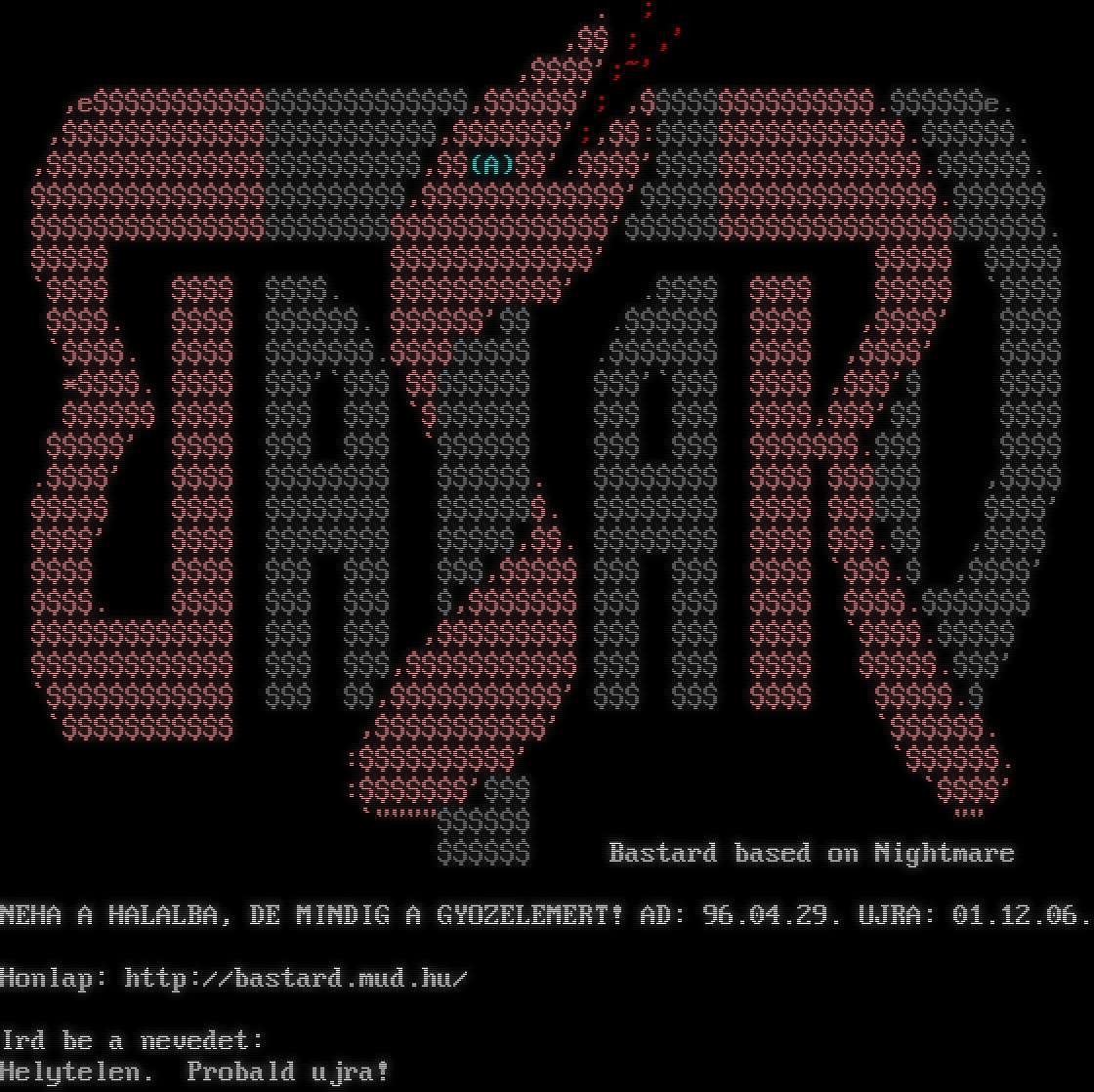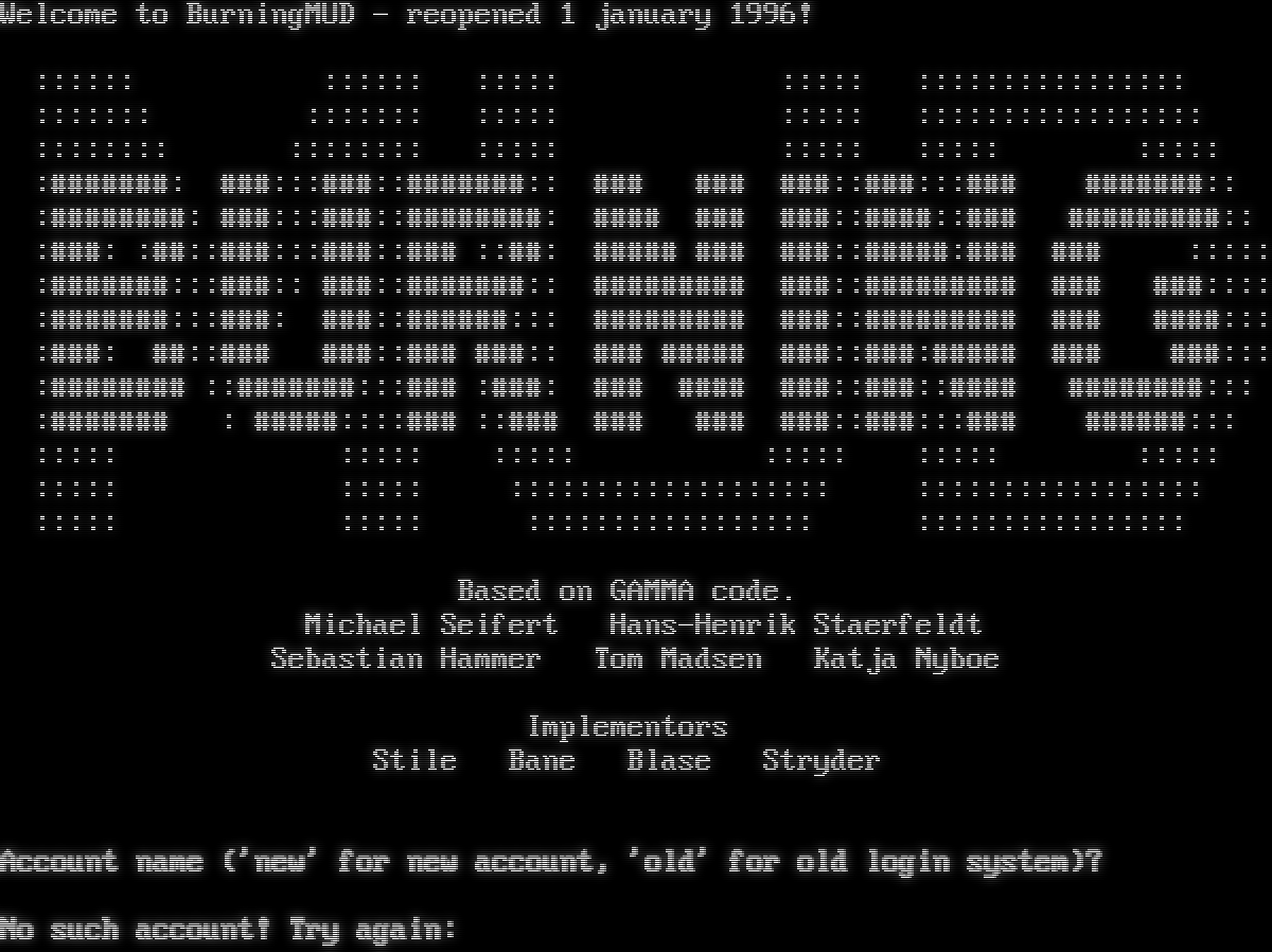 Welcome to BurningMUD - reopened 1 january 1996! :::::: :::::: ::::: ::::: :::::::::::::::: ::::::: ::::::: ::::: ::::: ::::::::::::::::: :::::::: :::::::: ::::: ::::: ::::: ::::: :#​######: ###:::###::#​######:: ### ### ###::###:::### #​######:: :#​#######: ###:::###::#​#######: #​### ### ###::#​###::### #​########:: :###: :##::###:::###::### ::##: #​#### ### ###::#​####:### ### ::::: :#​######:::###:: ###::#​######:: #​######## ###::#​######## ### ###:::: :#​######:::###: ###::#​#####::: #​######## ###::#​######## ### #​###::: :###: ##::### ###::### ###:: ### #​#### ###::###:#​#### ### ###::: :#​####### ::#​######:::### :###: ### #​### ###::###::#​### #​#######::: :#​###### : #​####::::### ::### ### ### ###::###:::### #​#####::: ::::: ::::: ::::: ::::: ::::: ::::: ::::: ::::: ::::::::::::::::::: ::::::::::::::::: ::::: ::::: ::::::::::::::::: :::::::::::::::: Based on GAMMA code. Michael Seifert Hans-Henrik Staerfeldt Sebastian Hammer Tom Madsen Katja Nyboe Implementors Stile Bane Blase Stryder Account name ('new' for new account, 'old' for old login system)? No such account! Try again:
