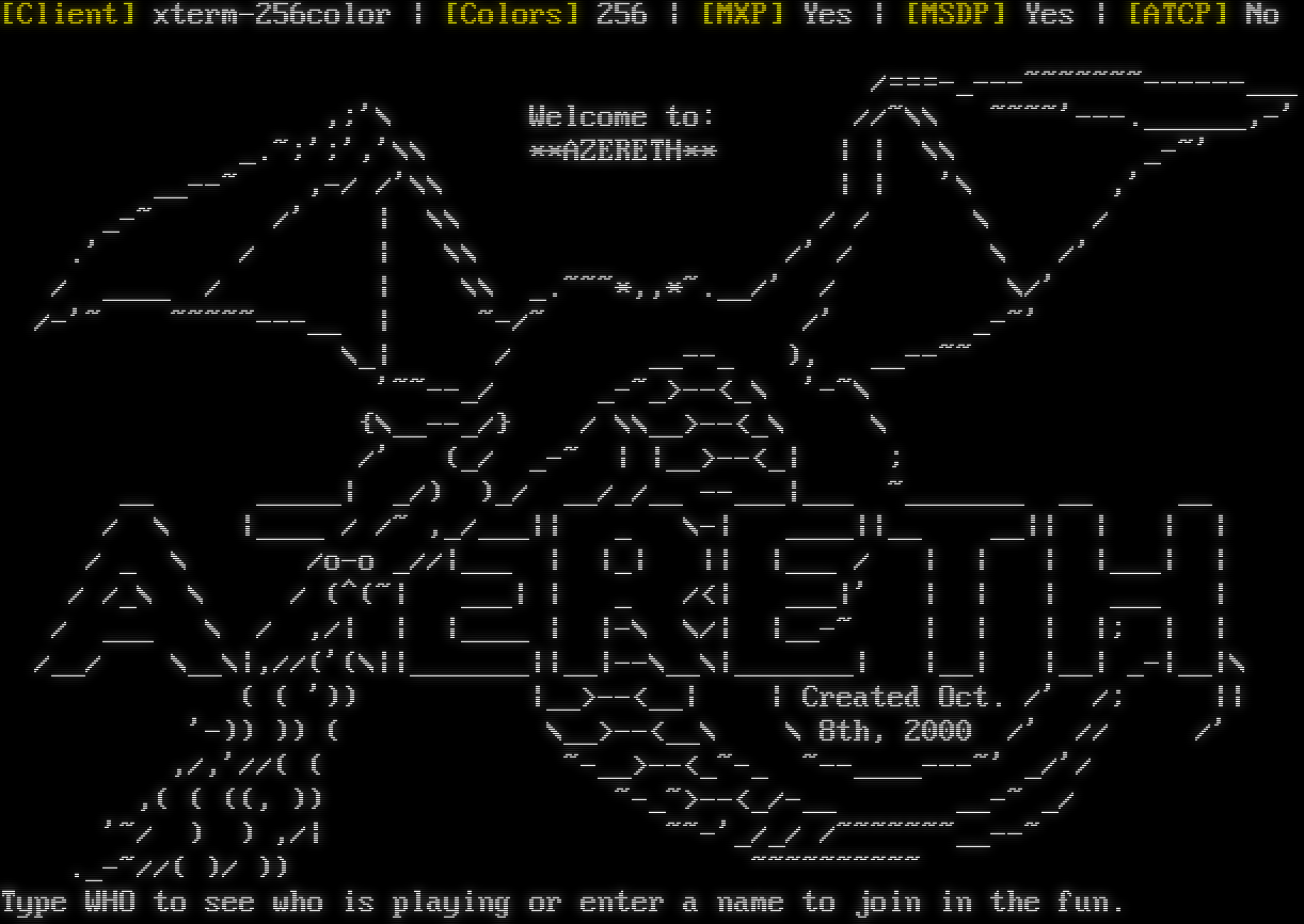 Attempting to Detect Client, Please Wait... [Client] xterm-256color \| [Colors] 256 \| [MXP] Yes \| [MSDP] Yes \| [ATCP] No /=​==-_---~~~~~~~------___ ,;'\\ Welcome to: //~\\\\ ~​~~~'-​--.______,-' _.~;';','\\\\ \*\*AZERETH\*\* \| \| \\\\ _-~' _​_--~ ,-/ /'\\\\ \| \| '\\ ,' _-~ /' \| \\\\ / / \\ / .' / \| \\\\ /' / \\ /' / _​___ / \| \\\\ _​.~~~\*,,\*~​.__/' / \\/' /-'~ ~​~~~~---__ \| ~-/~ /' _-~' \\_\| / _​_--_ ), _​_--~~ '~​~--_/ _​-~_>--<_\\ '-~\\ {\\_​_--_/} / \\\\__>--<_\\ \\ /' (_/ _-~ \| \|__>--<_\| ; __ _​____\| _/) )_/ __/_/__ -​-___\|___ ~​_______ __ __ / \\ \|_​___ / /~ ,_/___\|\| _ \\-\| _​___\|\|__ __\|\| \| \| \| / _ \\ /o-o _//\|___ \| \|_\| \|\| \|___ / \| \| \| \|___\| \| / /_\\ \\ / (^(~\| ___\| \| _ /<\| ___\|' \| \| \| ___ \| / ___ \\ / ,/\| \| \|_​___ \| \|-\\ \\/\| \|_​_-~ \| \| \| \|; \| \| /__/ \\__\\\|,//('(\\\|\|_​______\|\|__\|--\\__\\\|_​______\| \|__\| \|__\| _-\|__\|\\ ( ( ')) \|__>--<__\| \| Created Oct. /' /; \|\| '-)) )) ( \\__>--<__\\ \\ 8th, 2000 /' // /' ,/,'//( ( ~​-__>--<_​~-_ ~​--____---~' _/'/ ,( ( ((, )) ~​-_~>--<_/-__ _​_-~ _/ '~/ ) ) ,/\| ~~-'_/_/ /~​~~~~~~__--~ .​_-~//( )/ )) ~​~~~~~~~~~ Type WHO to see who is playing or enter a name to join in the fun.
