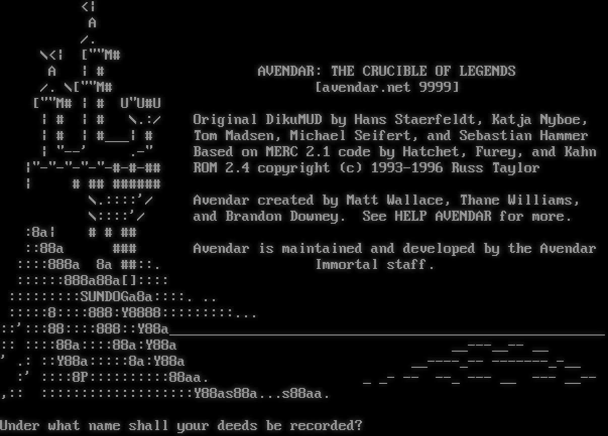 <\| A /. \\<\| [""M# A \| # AVENDAR: THE CRUCIBLE OF LEGENDS /. \\[""M# [avendar.net 9999] [""M# \| # U"U#U \| # \| # \\.:/ Original DikuMUD by Hans Staerfeldt, Katja Nyboe, \| # \| #​___\| # Tom Madsen, Michael Seifert, and Sebastian Hammer \| "--' .-" Based on MERC 2.1 code by Hatchet, Furey, and Kahn \|"​-"-"-"-"-#-#-## ROM 2.4 copyright (c) 1993-1996 Russ Taylor \| # ## #​##### \\.::::'/ Avendar created by Matt Wallace, Thane Williams, \\::::'/ and Brandon Downey. See HELP AVENDAR for more. :8a\| # # ## ::88a ### Avendar is maintained and developed by the Avendar ::::888a 8a ##::. Immortal staff. ::::::888a88a[]:::: :::::::::SUNDOGa8a::::. .. :::::8::::888:Y8888:::::::::... ::':::88::::888::Y88a_​_____________________________________________________ :: ::::88a::::88a:Y88a _​_---__-- __ ' .: ::Y88a:::::8a:Y88a _​_----_-- -​------_-__ :' ::::8P::::::::::88aa. _ _- -- --_ --- __ --- _​_-- ,:: :::::::::::::::::::Y88as88a...s88aa. Under what name shall your deeds be recorded?