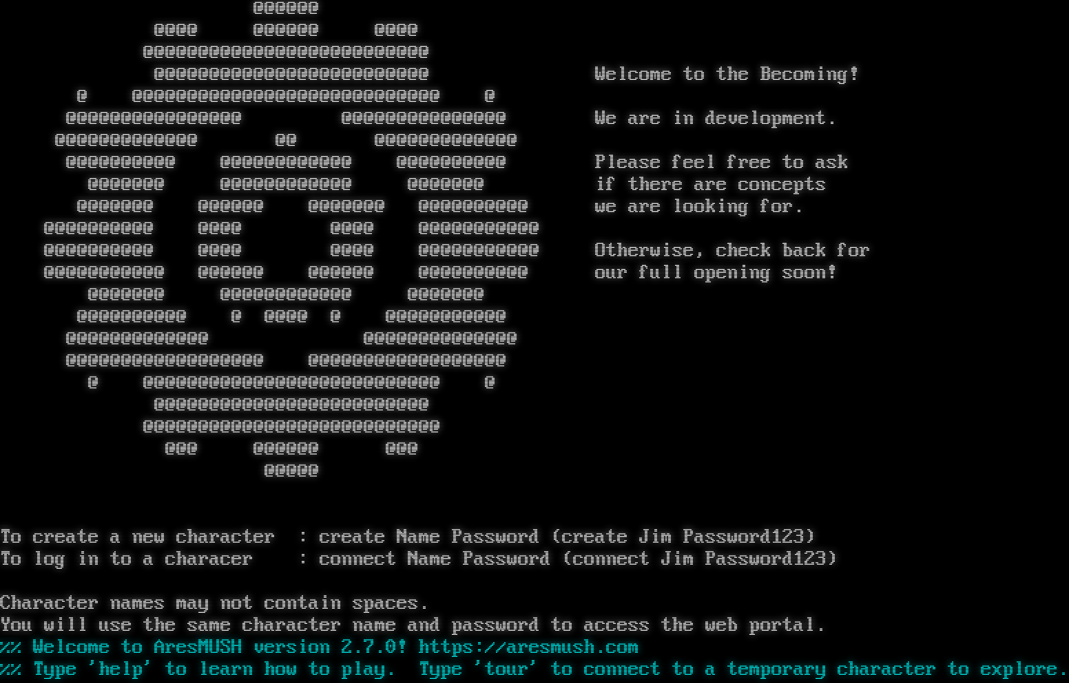 @@@@@@ @@@@ @@@@@@ @@@@ @@@@@@@@@@@@@@@@@@@@@@@@@@ @@@@@@@@@@@@@@@@@@@@@@@@@ Welcome to the Becoming! @ @@@@@@@@@@@@@@@@@@@@@@@@@@@@ @ @@@@@@@@@@@@@@@@ @@@@@@@@@@@@@@@ We are in development. @@@@@@@@@@@@@ @@ @@@@@@@@@@@@@ @@@@@@@@@@ @@@@@@@@@@@@ @@@@@@@@@@ Please feel free to ask @@@@@@@ @@@@@@@@@@@@ @@@@@@@ if there are concepts @@@@@@@ @@@@@@ @@@@@@@ @@@@@@@@@@ we are looking for. @@@@@@@@@@ @@@@ @@@@ @@@@@@@@@@@ @@@@@@@@@@ @@@@ @@@@ @@@@@@@@@@@ Otherwise, check back for @@@@@@@@@@@ @@@@@@ @@@@@@ @@@@@@@@@@ our full opening soon! @@@@@@@ @@@@@@@@@@@@ @@@@@@@ @@@@@@@@@@ @ @@@@ @ @@@@@@@@@@@ @@@@@@@@@@@@@ @@@@@@@@@@@@@@ @@@@@@@@@@@@@@@@@@ @@@@@@@@@@@@@@@@@@ @ @@@@@@@@@@@@@@@@@@@@@@@@@@@ @ @@@@@@@@@@@@@@@@@@@@@@@@@ @@@@@@@@@@@@@@@@@@@@@@@@@@@ @@@ @@@@@@ @@@ @@@@@ To create a new character : create Name Password (create Jim Password123) To log in to a characer : connect Name Password (connect Jim Password123) Character names may not contain spaces. You will use the same character name and password to access the web portal. %% Welcome to AresMUSH version 2.7.0! https://aresmush.com %% Type 'help' to learn how to play. Type 'tour' to connect to a temporary character to explore.