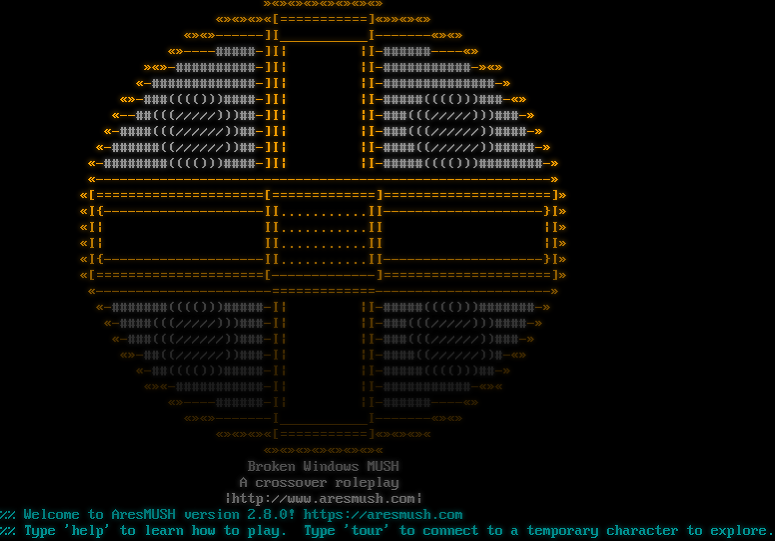 »«»«»«»«»«»«»«» «»«»«»«[=​==========]«»»«»«» «»«»-​-----]I_​__________I-​------«»«» «»-​---#####-]I\| \|I-​######----«» »«»-​##########-]I\| \|I-​###########-»«» «-​#############-]I\| \|I-​##############-» «»-​###(((()))#​###-]I\| \|I-​#####(((()))#​##-«» «-​-##(((/////)))##-]I\| \|I-​###(((/////)))#​##-» «-​####(((//////))##-]I\| \|I-​###(((//////))#​###-» «-​######((//////))##-]I\| \|I-​####((//////))#​####-» «-​########(((()))#​###-]I\| \|I-​#####(((()))#​#######-» «-​--------------------------------------------------------» «[=​====================[=​============]=​====================]» «I{-​-------------------II.​..........II-​-------------------}I» «I\| II.​..........II \|I» «I\| II.​..........II \|I» «I{-​-------------------II.​..........II-​-------------------}I» «[=​====================[-​------------]=​====================]» «-​---------------------=============----------------------» «-​#######(((()))#​####-I\| \|I-​#####(((()))#​######-» «-​####(((/////)))#​##-I\| \|I-​###(((/////)))#​###-» «-​###(((//////))#​##-I\| \|I-​###(((//////))#​##-» «»-##((//////))#​##-I\| \|I-​####((//////))#-«» «-##(((()))#​####-I\| \|I-​#####(((()))##-» «»«-​###########-I\| \|I-​###########-«»« «»-​---######-I\| \|I-​######----«» «»«»-​------I_​__________I-​------«»«» «»«»«»«[=​==========]«»«»«»« «»«»«»«»«»«»«»« Broken Windows MUSH A crossover roleplay \|http://www.aresmush.com\| %% Welcome to AresMUSH version 2.8.0! https://aresmush.com %% Type 'help' to learn how to play. Type 'tour' to connect to a temporary character to explore.