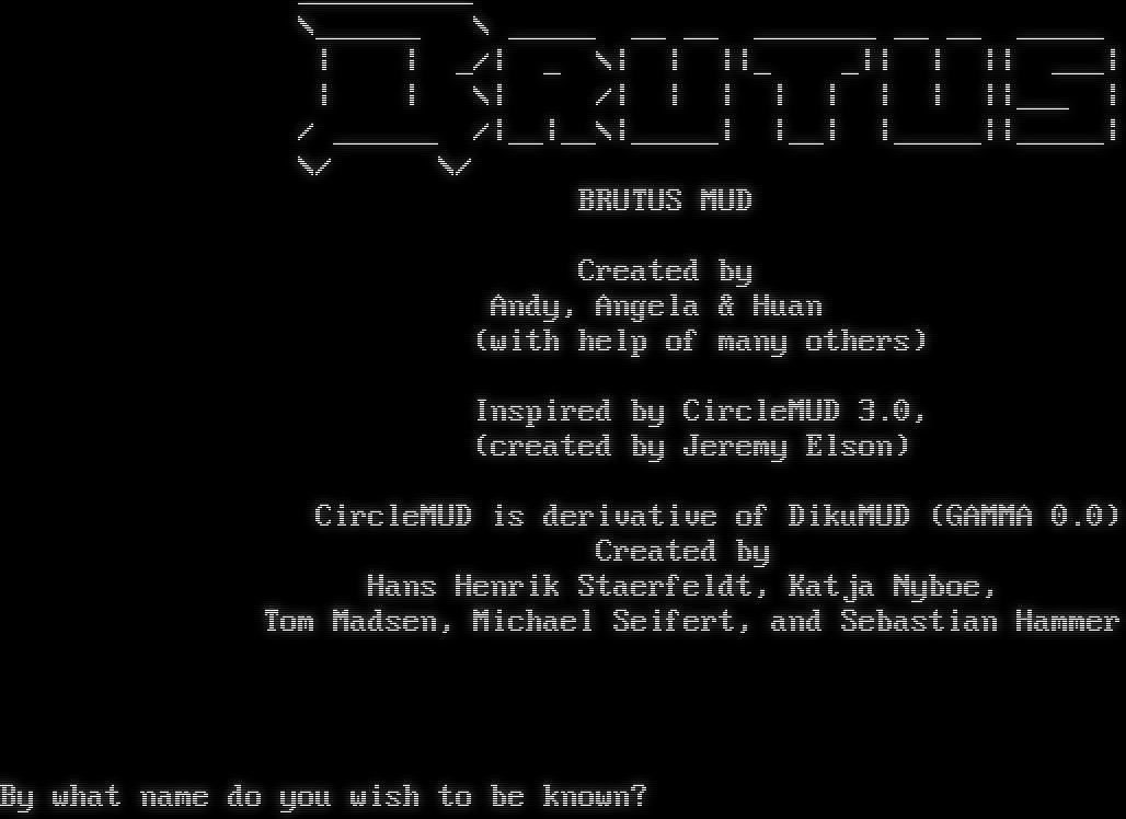 _​_________ \\_​_____ \\ _​____ __ __ _​______ __ __ _​____ \| \| _/\| _ \\\| \| \|\|_ _\|\| \| \|\| ___\| \| \| \\\| /\| \| \| \| \| \| \| \|\|___ \| / _​_____ /\|__\|__\\\|_​____\| \|__\| \|_​____\|\|_​____\| \\/ \\/ BRUTUS MUD Created by Andy, Angela & Huan (with help of many others) Inspired by CircleMUD 3.0, (created by Jeremy Elson) CircleMUD is derivative of DikuMUD (GAMMA 0.0) Created by Hans Henrik Staerfeldt, Katja Nyboe, Tom Madsen, Michael Seifert, and Sebastian Hammer By what name do you wish to be known?