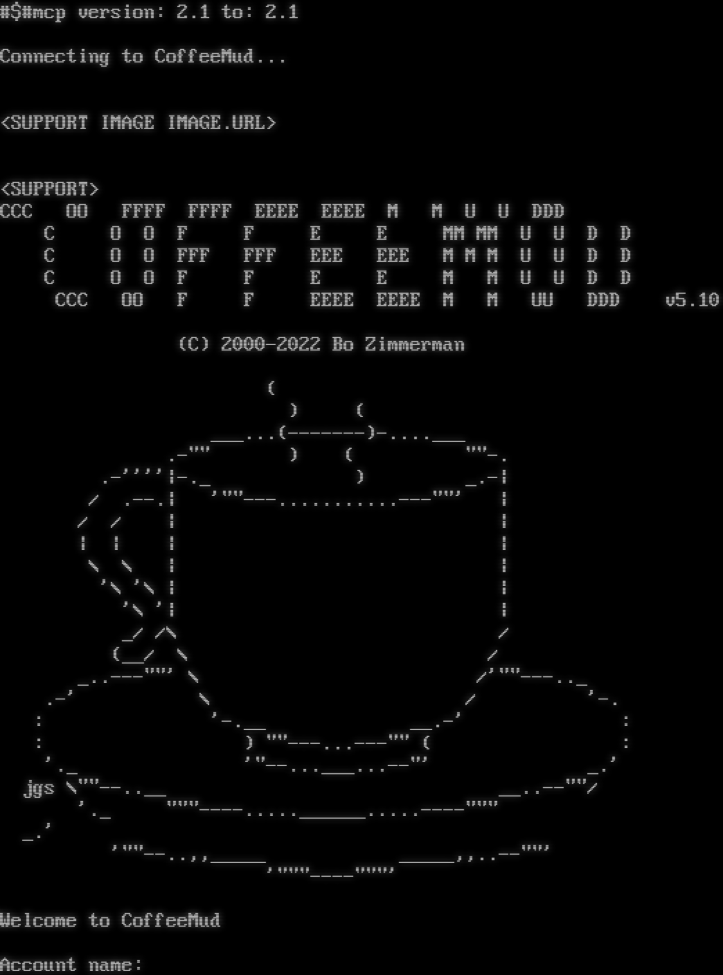 #$#mcp version: 2.1 to: 2.1 Connecting to CoffeeMud... <SUPPORT IMAGE IMAGE.URL> <SUPPORT> CCC OO FFFF FFFF EEEE EEEE M M U U DDD C O O F F E E MM MM U U D D C O O FFF FFF EEE EEE M M M U U D D C O O F F E E M M U U D D CCC OO F F EEEE EEEE M M UU DDD v5.10 (C) 2000-2022 Bo Zimmerman ( ) ( _​__...(-​------)-​....___ .-&quot;&quot; ) ( &quot;&quot;-. .-''''\|-._ ) _.-\| / .​--.\| '&quot;&quot;-​--...........---&quot;&quot;' \| / / \| \| \| \| \| \| \\ \\ \| \| '\\ '\\ \| \| '\\ '\| \| _/ /\\ / (__/ \\ / _​..---&quot;&quot;' \\ /'&quot;&quot;-​--.._ .-' \\ / '-. : '-​.__ _​_.-' : : ) &quot;&quot;-​--...---&quot;&quot; ( : '._ '&quot;-​-...___...--&quot;' _.' jgs \\&quot;&quot;-​-..__ _​_..--&quot;&quot;/ '._ &quot;&quot;&quot;-​---.....______.....----&quot;&quot;&quot; _.' '&quot;&quot;-​-..,,_​____ _​____,,.​.--&quot;&quot;' '&quot;&quot;&quot;-​---&quot;&quot;&quot;' Welcome to CoffeeMud Account name: