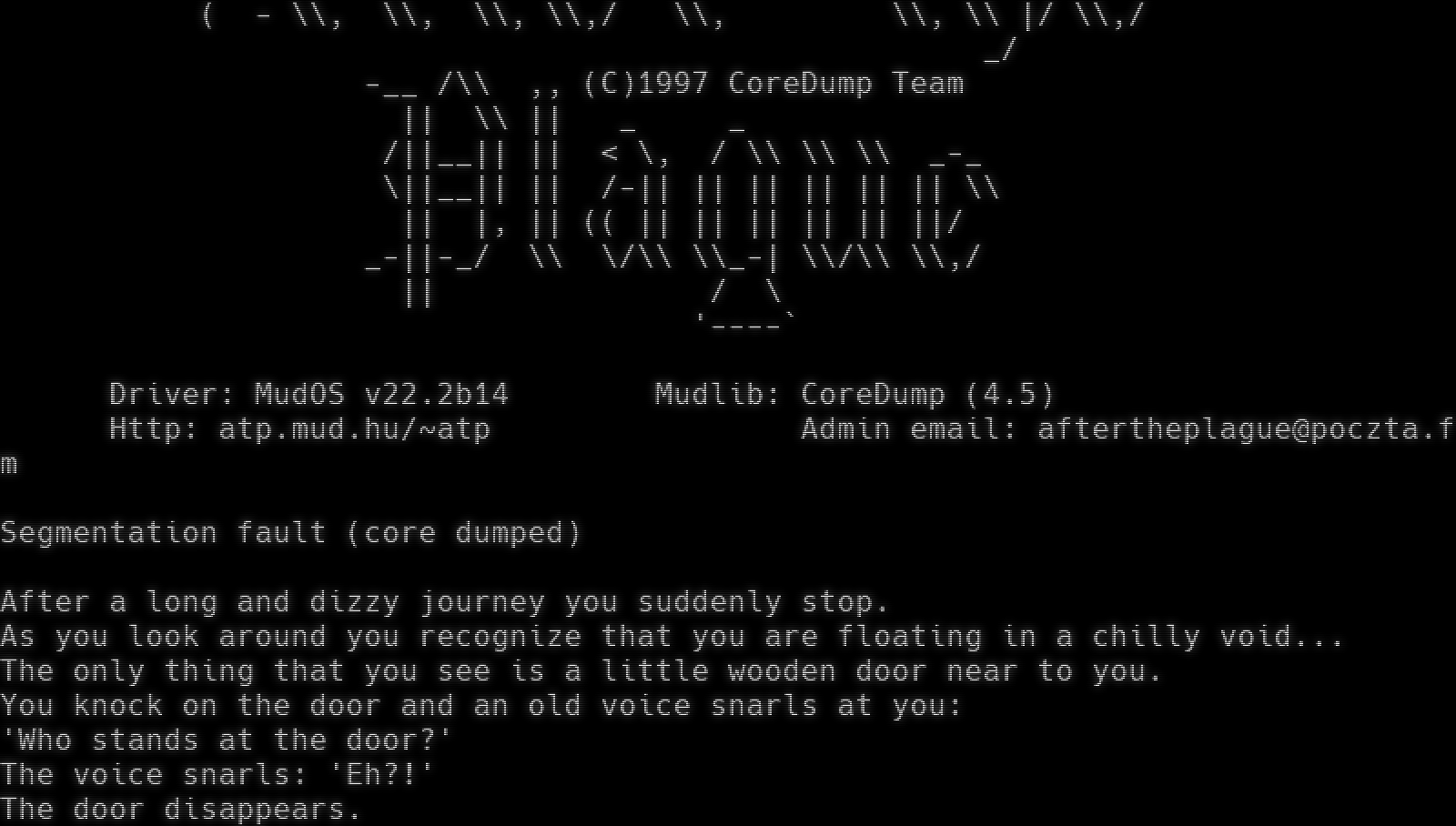 ___ - -_, /\\ , Welcome to , ,, ( ~/\|\| \|\| \|\| \|\| \|\| ( / \|\| =\|\|= =\|\|= _-_ ,.​_-_ =\|\|= \|\|/\\\\ _-_ \\/==\|\| \|\| \|\| \|\| \\\\ \|\| \|\| \|\| \|\| \|\| \\\\ /_ _\|\| \|\| \|\| \|\|/ \|\| \|\| \|\| \|\| \|\|/ ( - \\\\, \\\\, \\\\, \\\\,/ \\\\, \\\\, \\\\ \|/ \\\\,/ _/ -__ /\\\\ ,, (C)1997 CoreDump Team \|\| \\\\ \|\| _ _ /\|\|__\|\| \|\| < \\, / \\\\ \\\\ \\\\ _-_ \\\|\|__\|\| \|\| /-\|\| \|\| \|\| \|\| \|\| \|\| \\\\ \|\| \|, \|\| (( \|\| \|\| \|\| \|\| \|\| \|\|/ _-\|\|-_/ \\\\ \\/\\\\ \\\\_-\| \\\\/\\\\ \\\\,/ \|\| / \\ '-​---\` Driver: MudOS v22.2b14 Mudlib: CoreDump (4.5) Http: atp.mud.hu/~atp Admin email: aftertheplague@poczta.fm Segmentation fault (core dumped) After a long and dizzy journey you suddenly stop. As you look around you recognize that you are floating in a chilly void... The only thing that you see is a little wooden door near to you. You knock on the door and an old voice snarls at you: 'Who stands at the door?' The voice snarls: 'Eh?!' The door disappears.